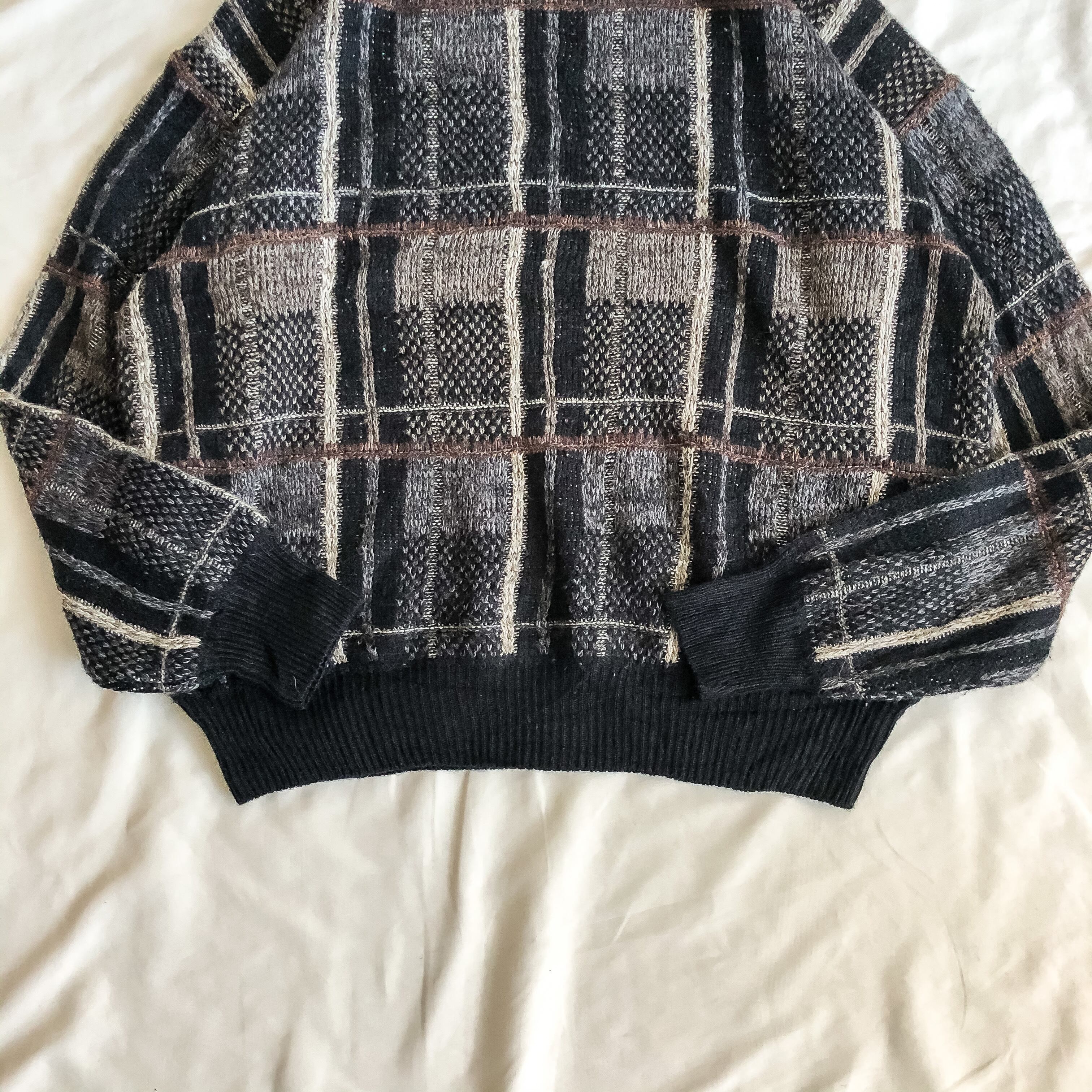 特徴 :ブラックベースにチェック柄のような格子状の独特な総柄のパターンが素晴らしいセーター。