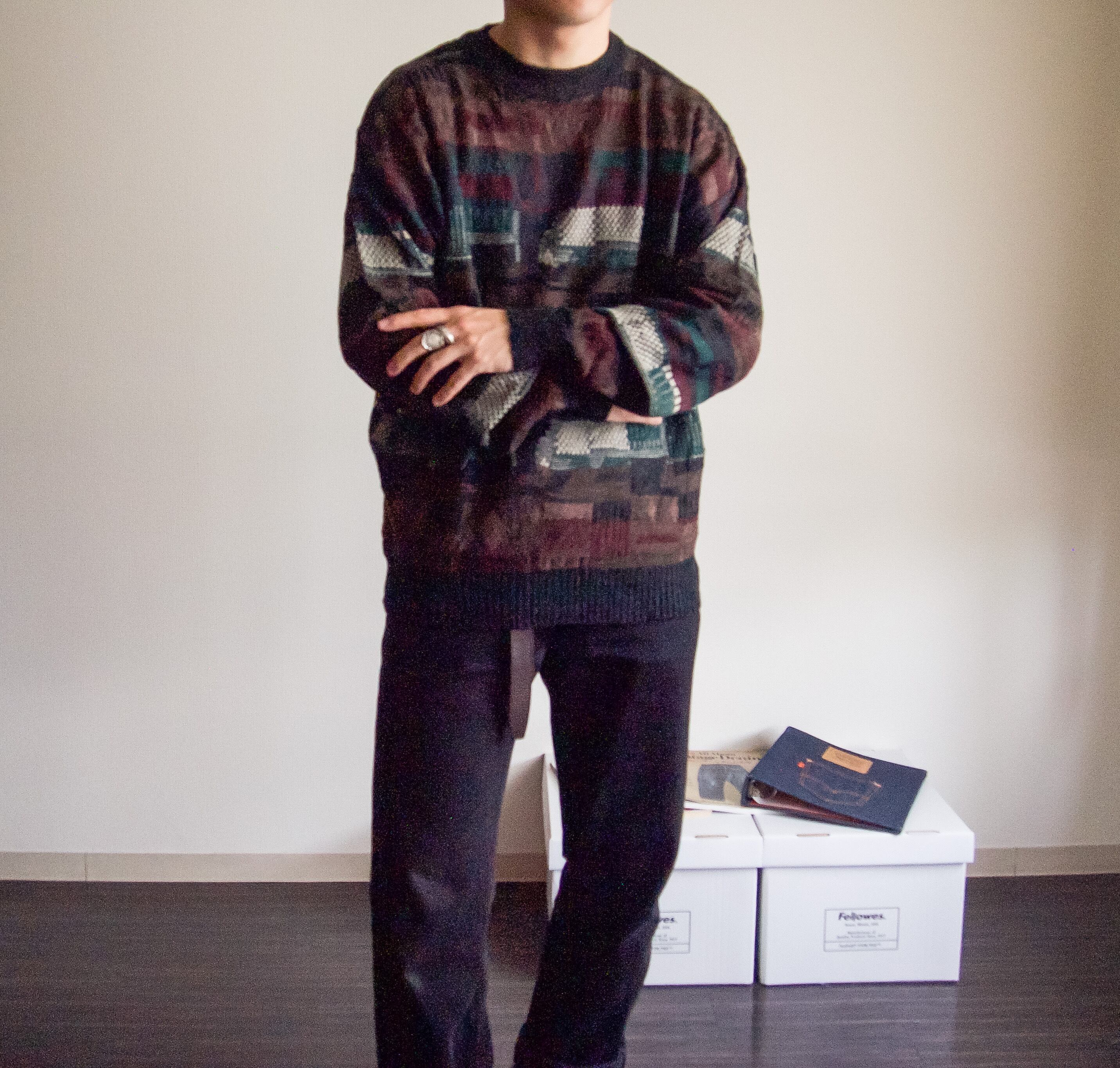 特徴 :何層にも柄が重なったような、独特な総柄のテキスタイルがグッドな総柄セーター。