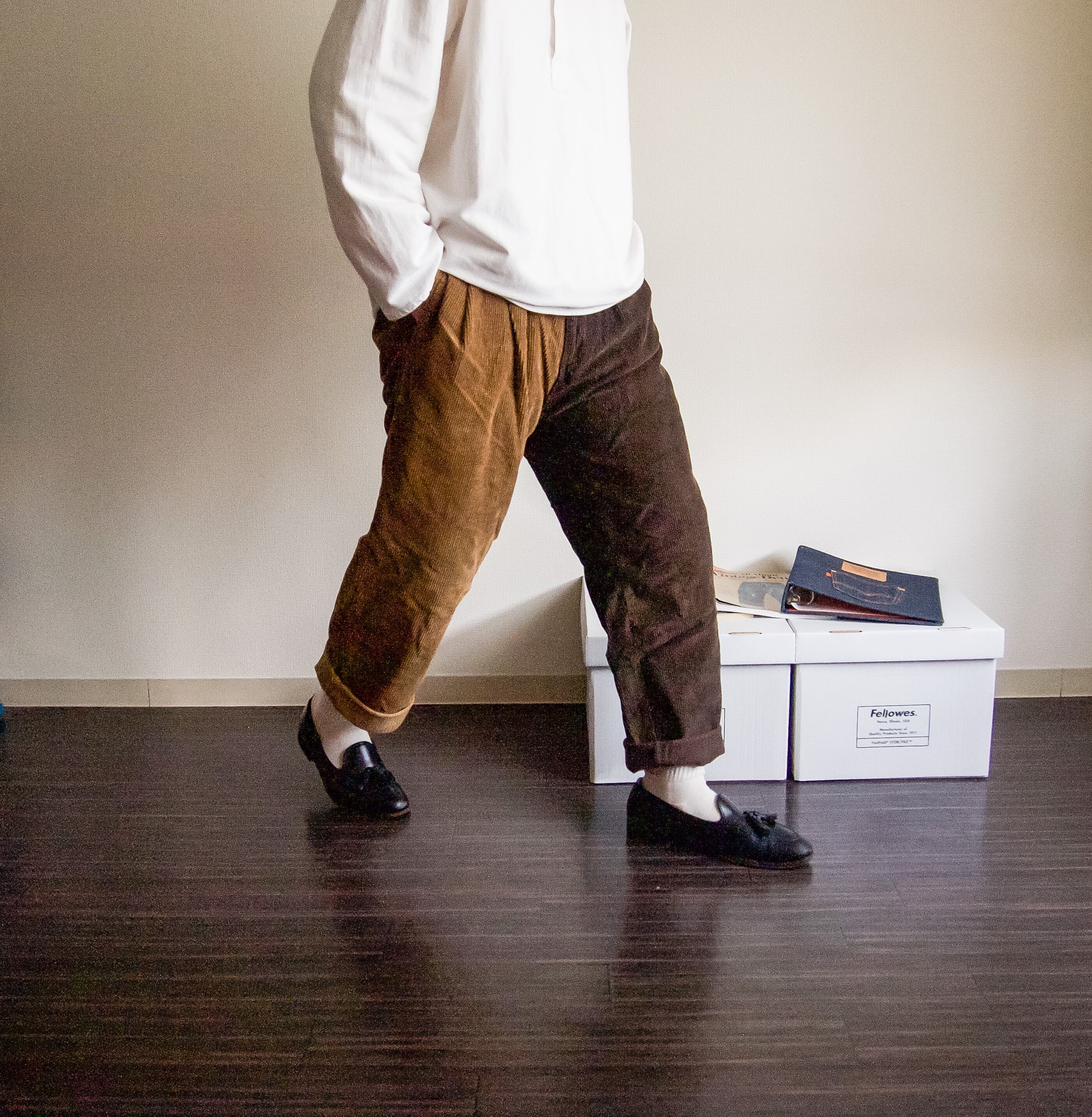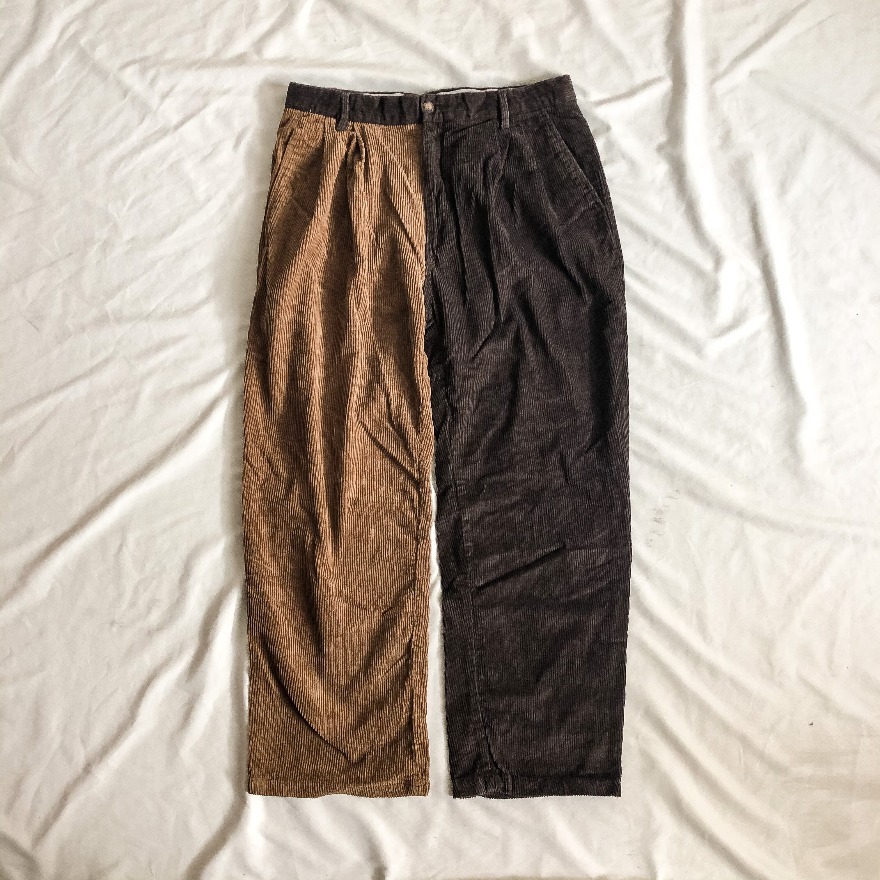 特徴 :トーンの違うブラウンカラーの太畝コーデュロイパンツを解体し、再構築して作られた贅沢な一本。