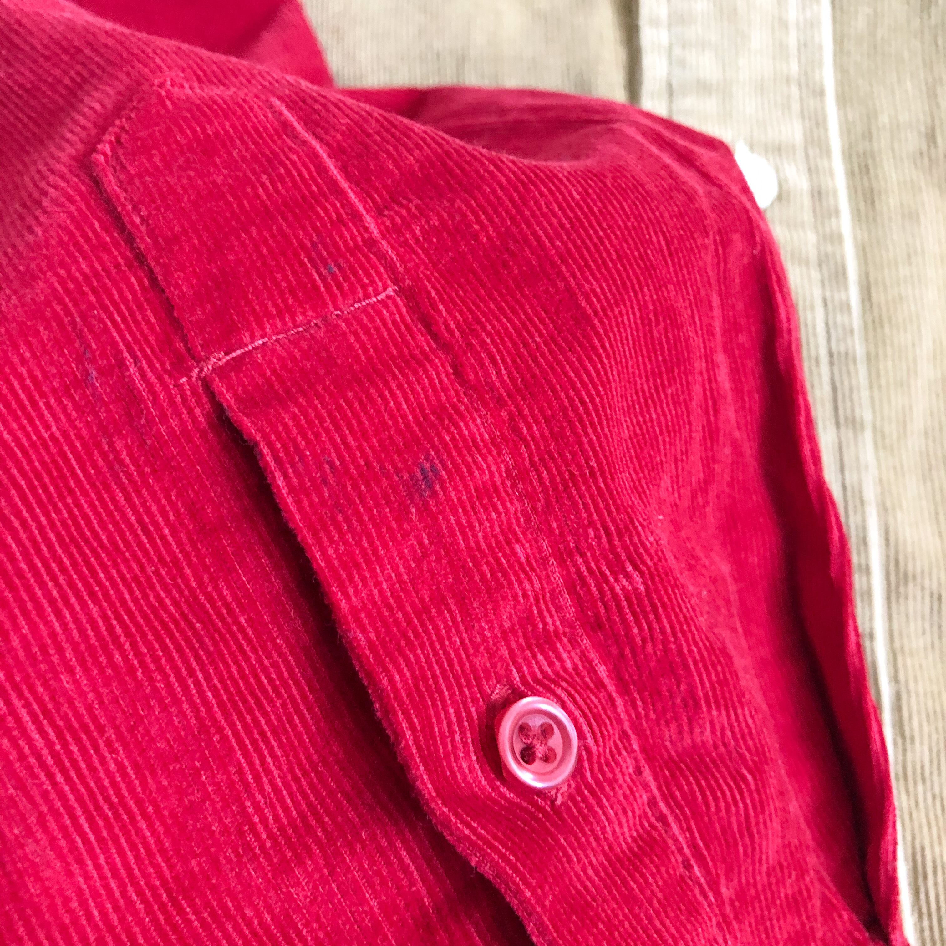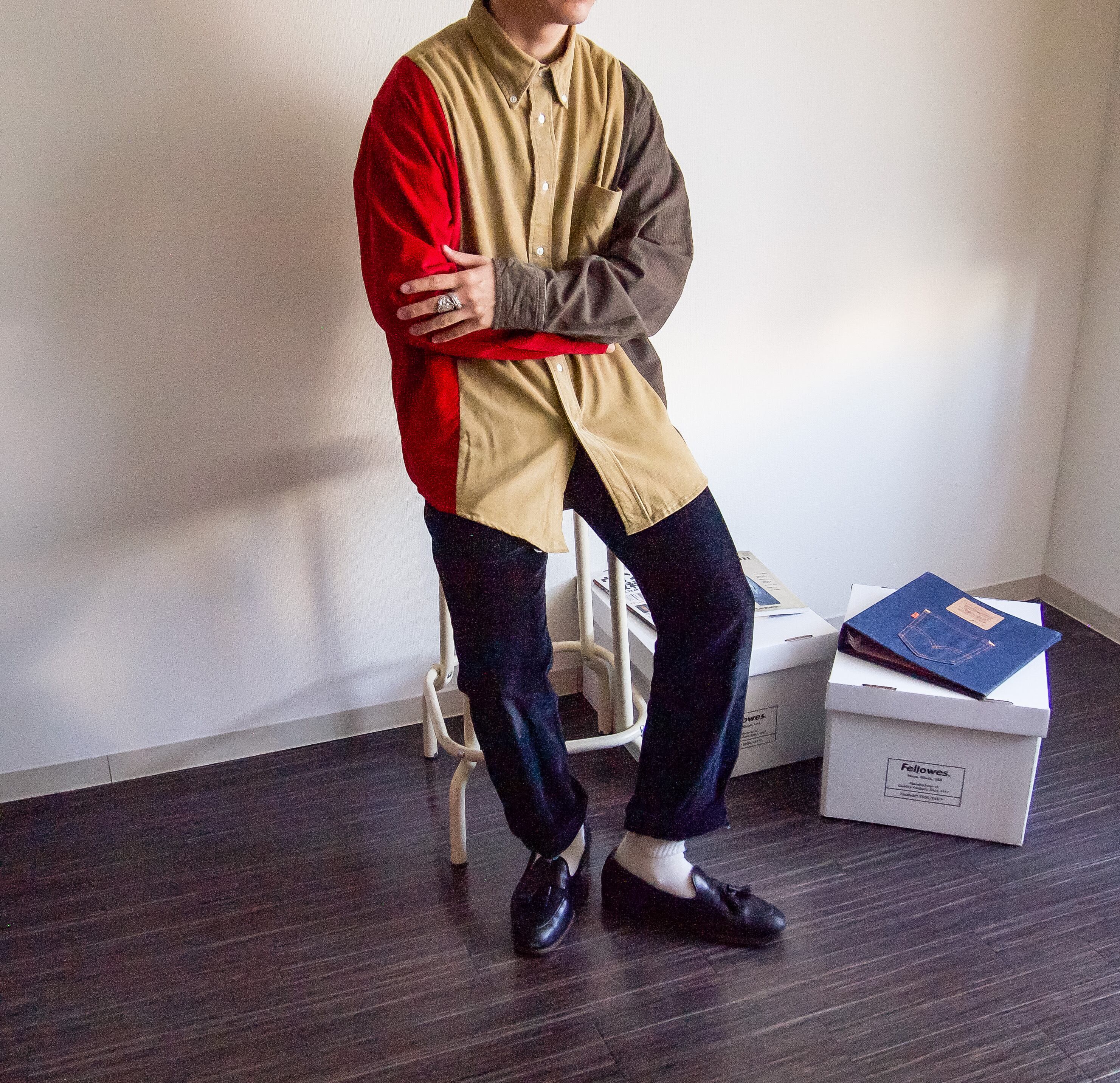 特徴 :ベージュ、グリーン、レッドのコーデュロイシャツを解体し、再構築して作られたリメイクのコーデュロイシャツ。