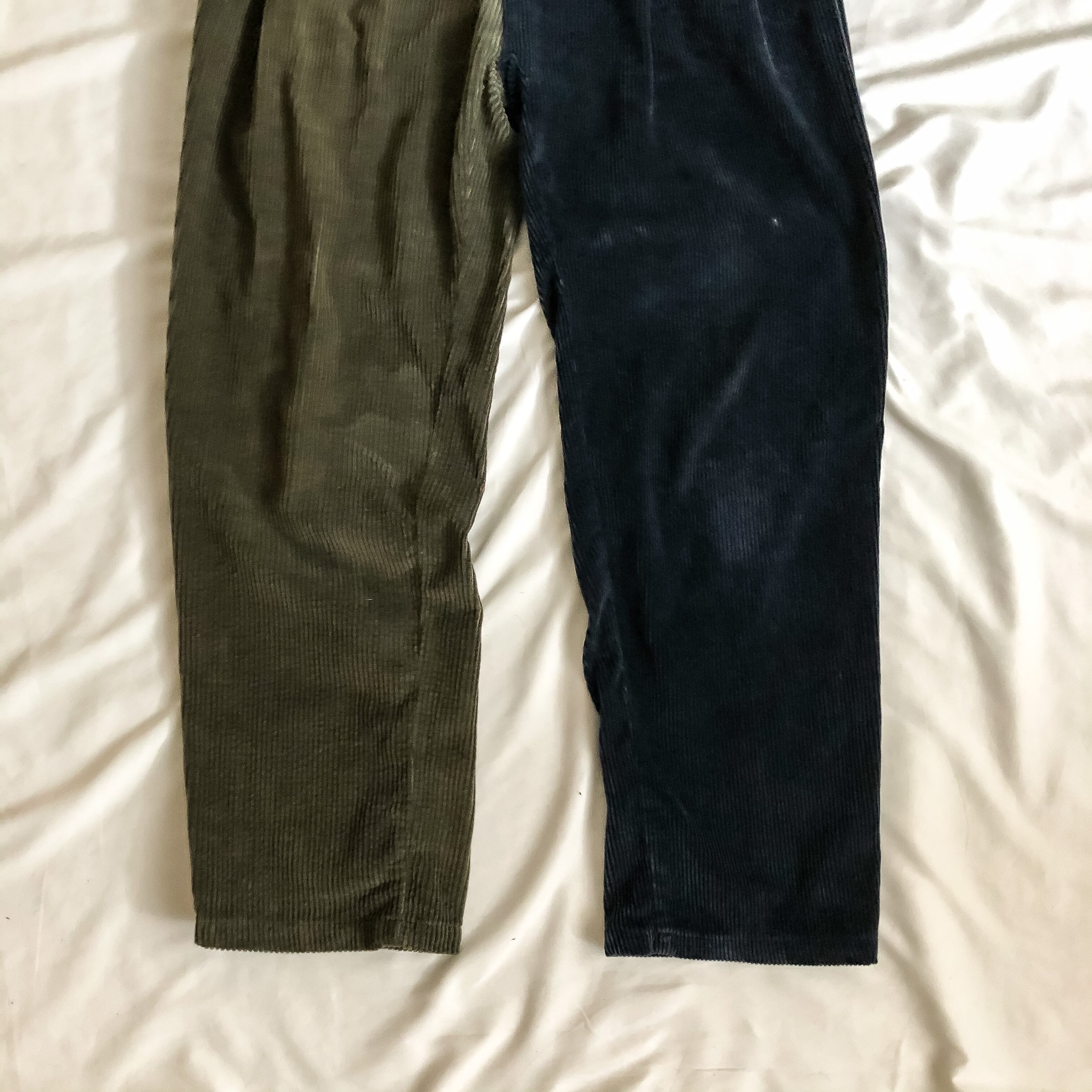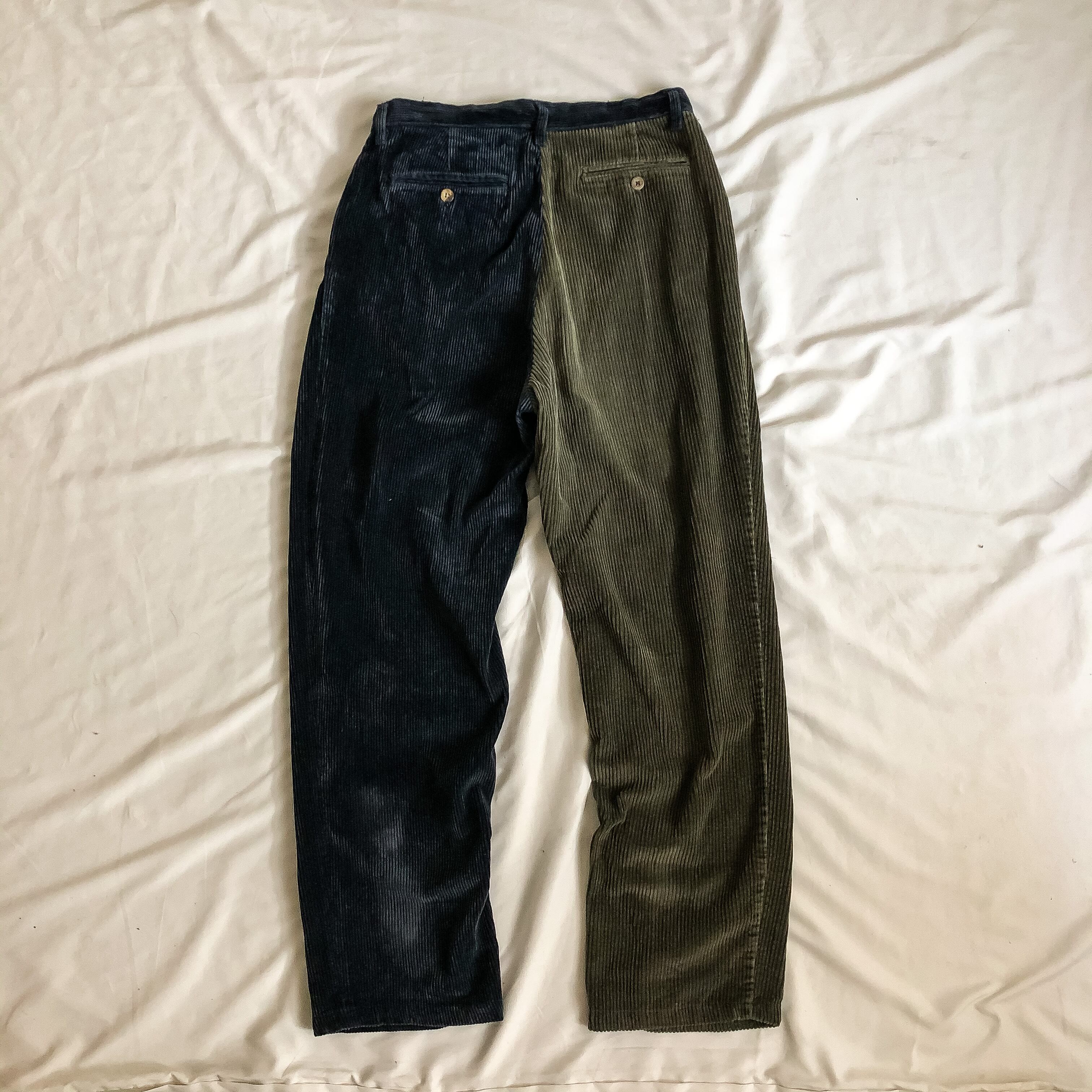 特徴 :グリーンとネイビーの太畝コーデュロイパンツを解体し、再構築して作られた贅沢な一本。