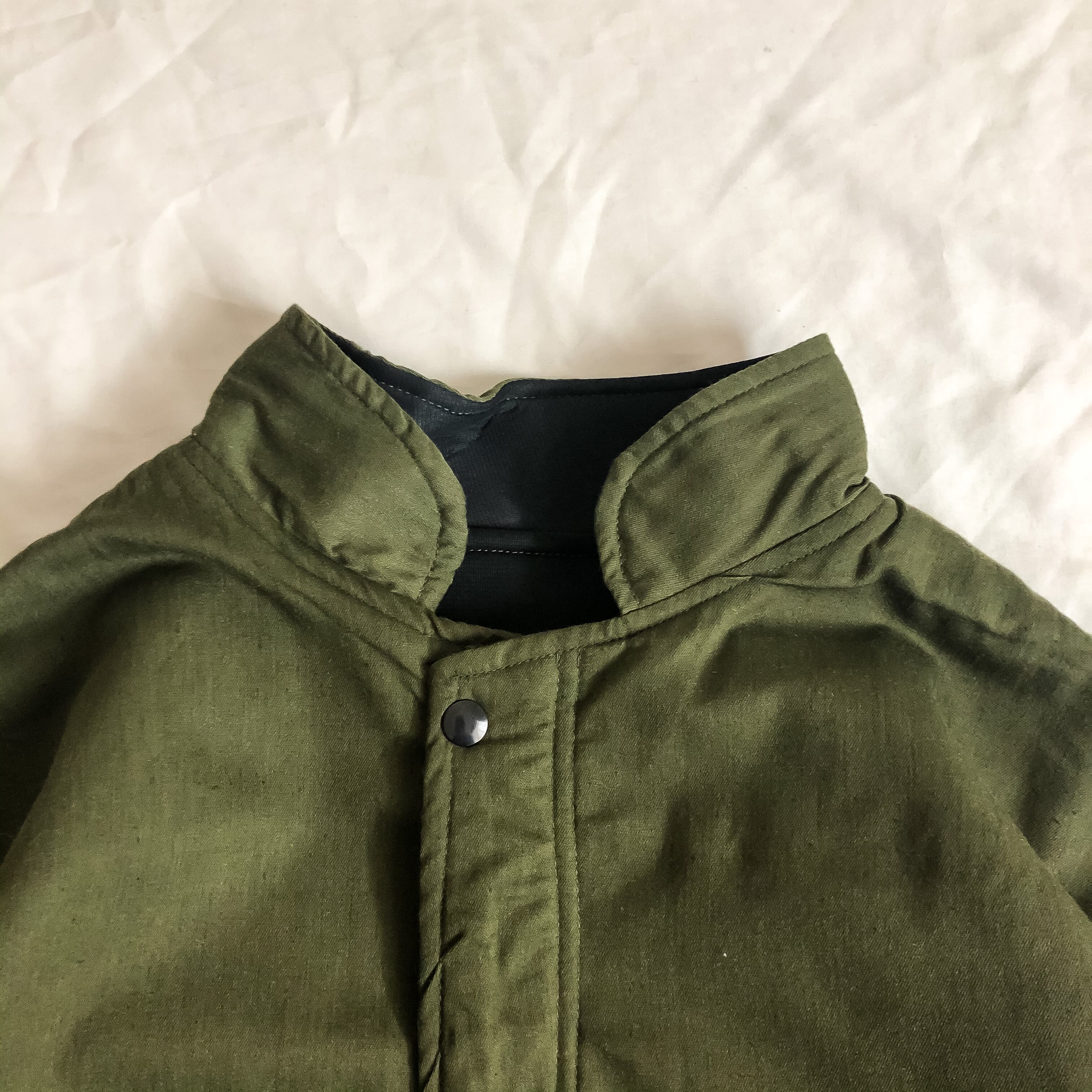 スタンドカラーにファティーグジャケットのような斜めのポケットが中央に付く洒落たディテール。