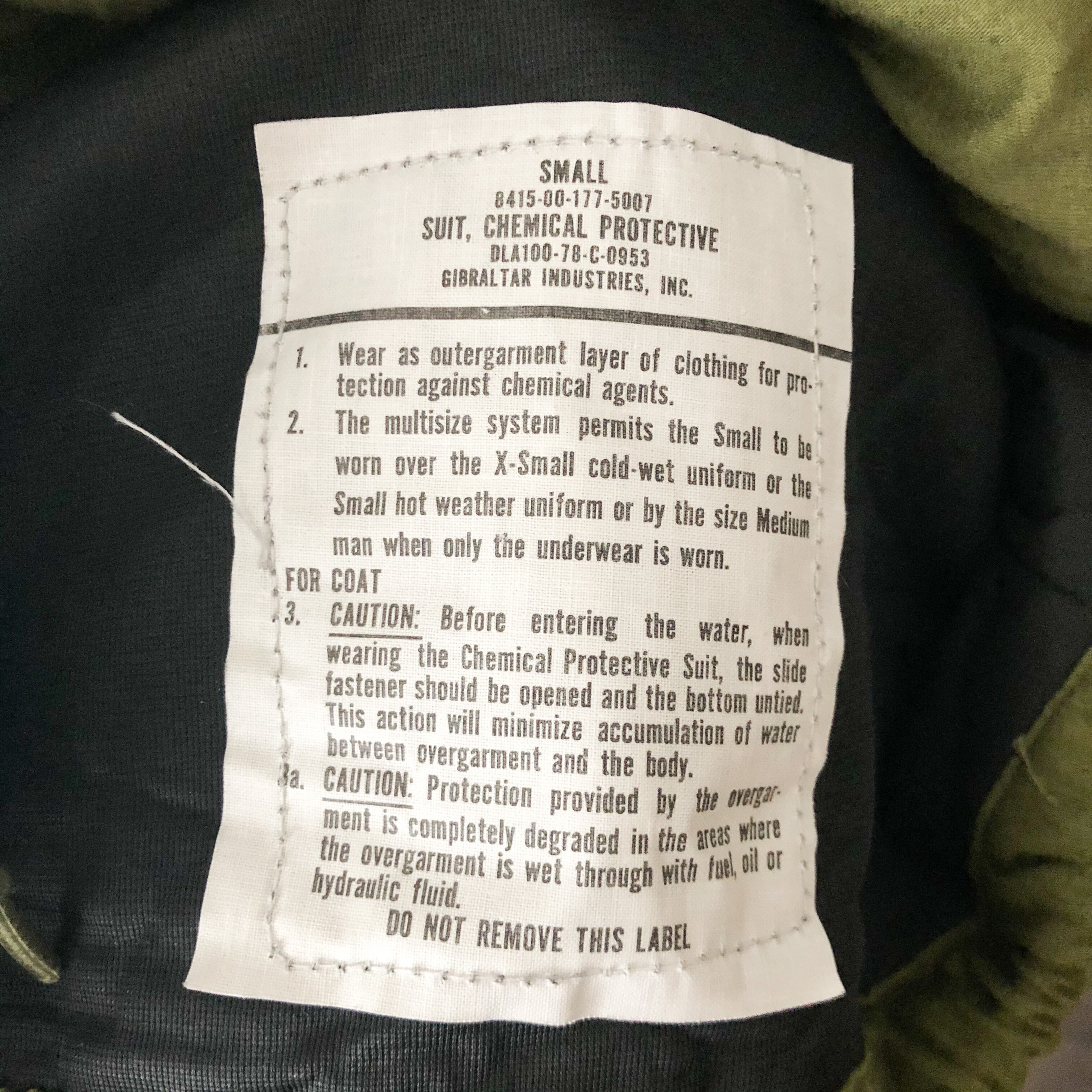 特徴 :1978年コントラクトのアメリカ軍 対化学兵器用 ケミカル・プロテクティブスーツ。