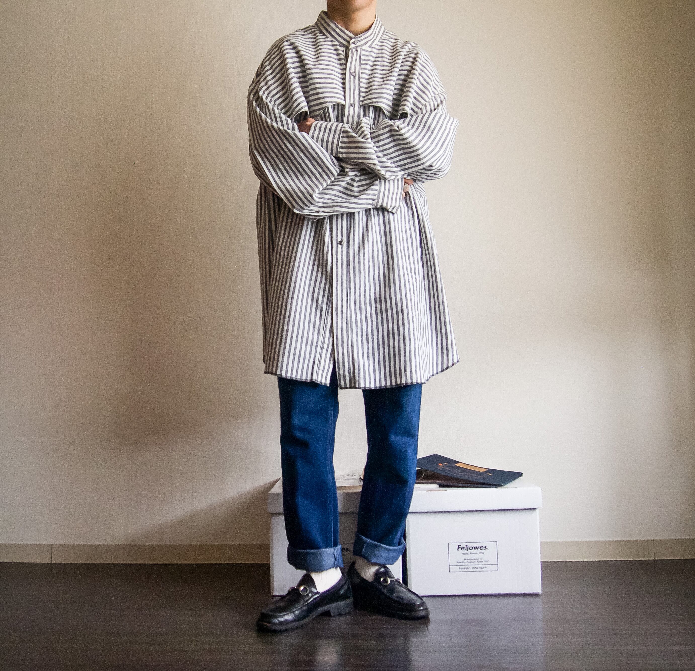 ウエスタンシャツでは見ないヒッコリーストライプに、ウエスタンシャツ特有の尖った襟ではなくバンドカラーで、身幅たっぷりのスーパービッグサイズ。