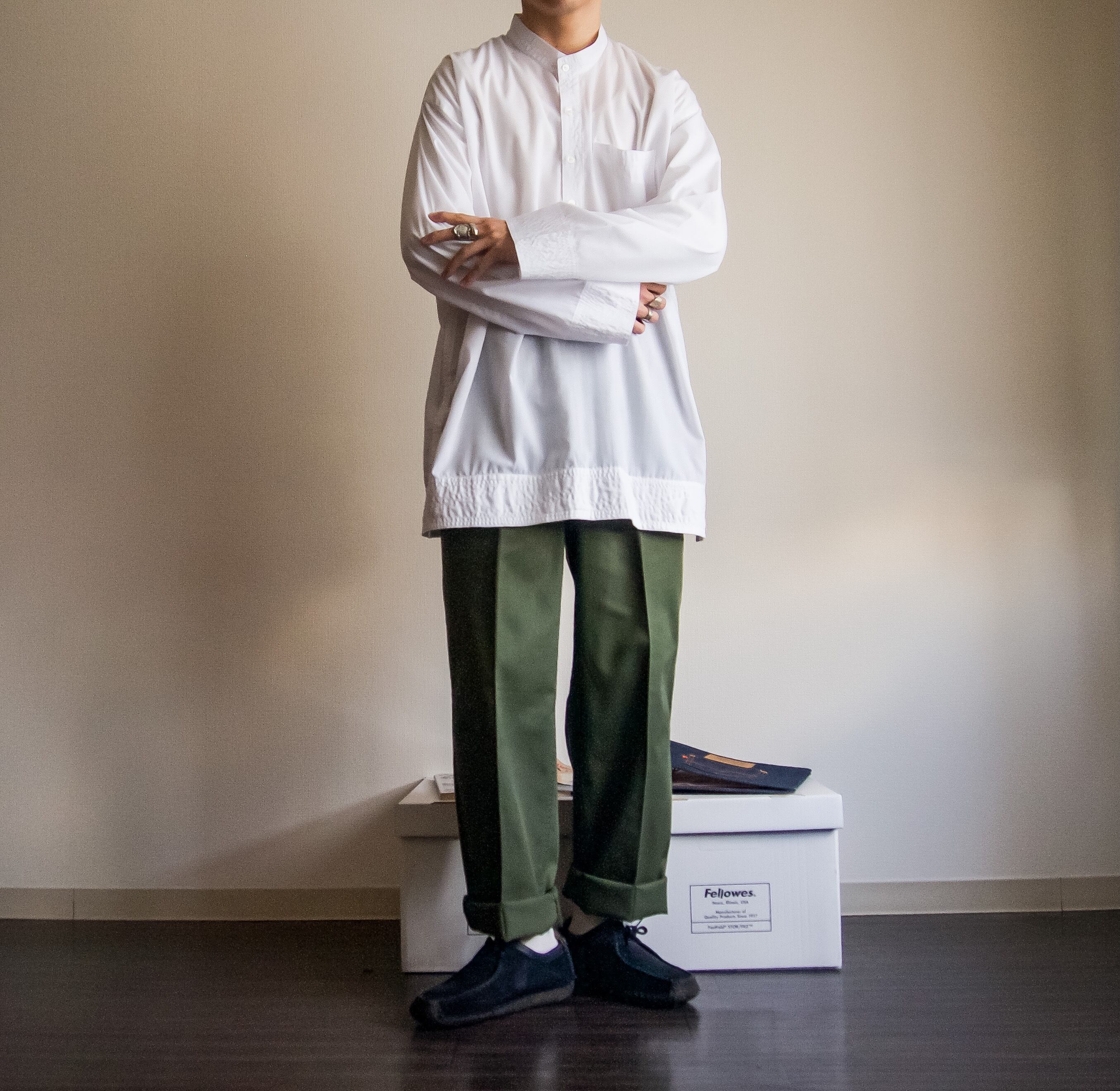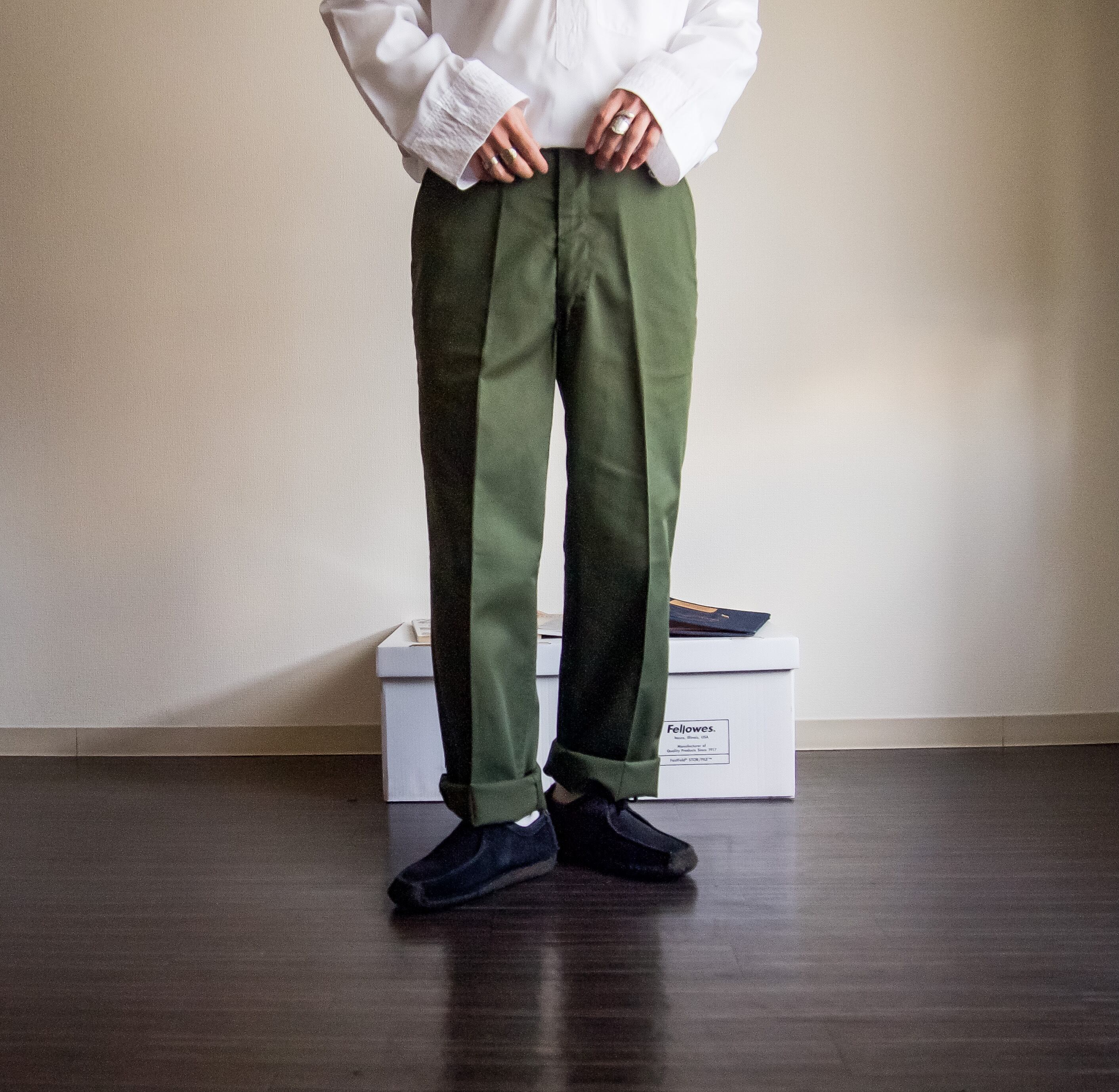 オールコットンの良さは言わずもがなですが、コットンポリはスラックスに近いような雰囲気で、また違った良さがあると思いますね。