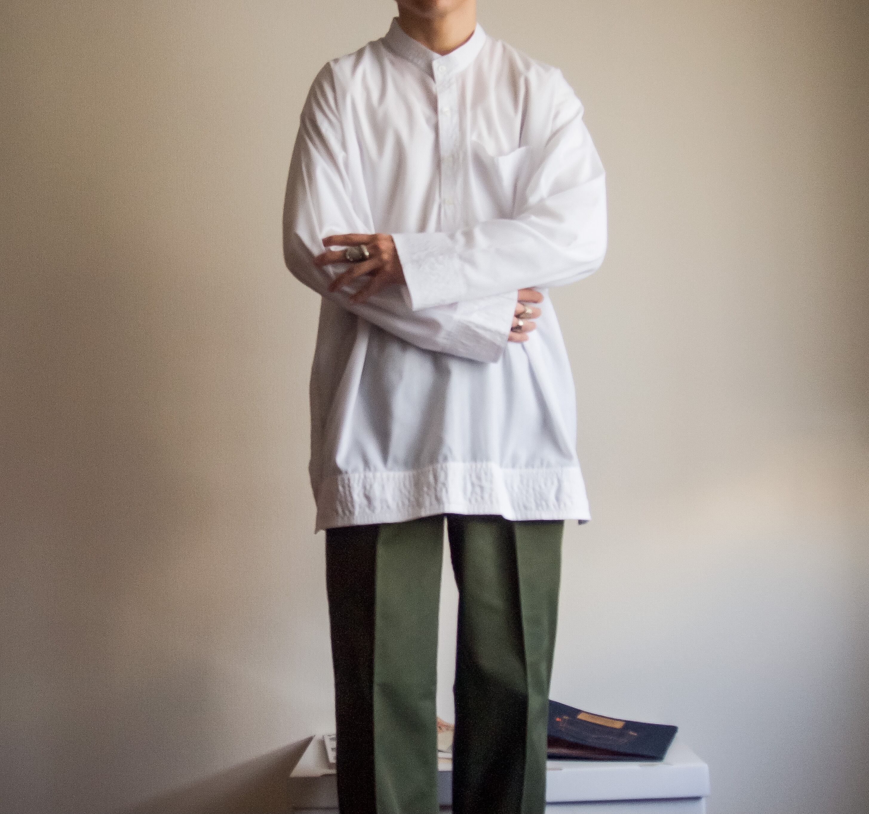 特徴 :ハーフボタンのプルオーバーに爽やかなホワイトカラーのバンドカラーシャツ。