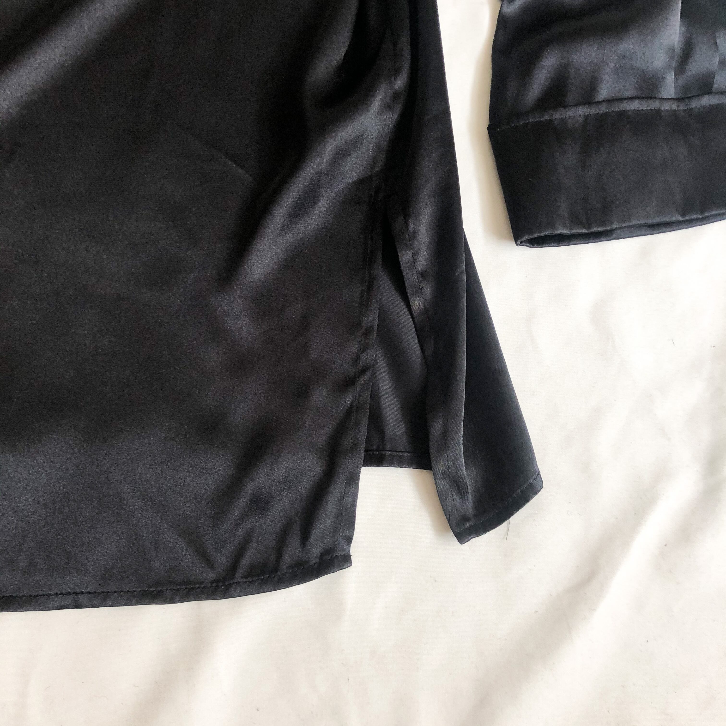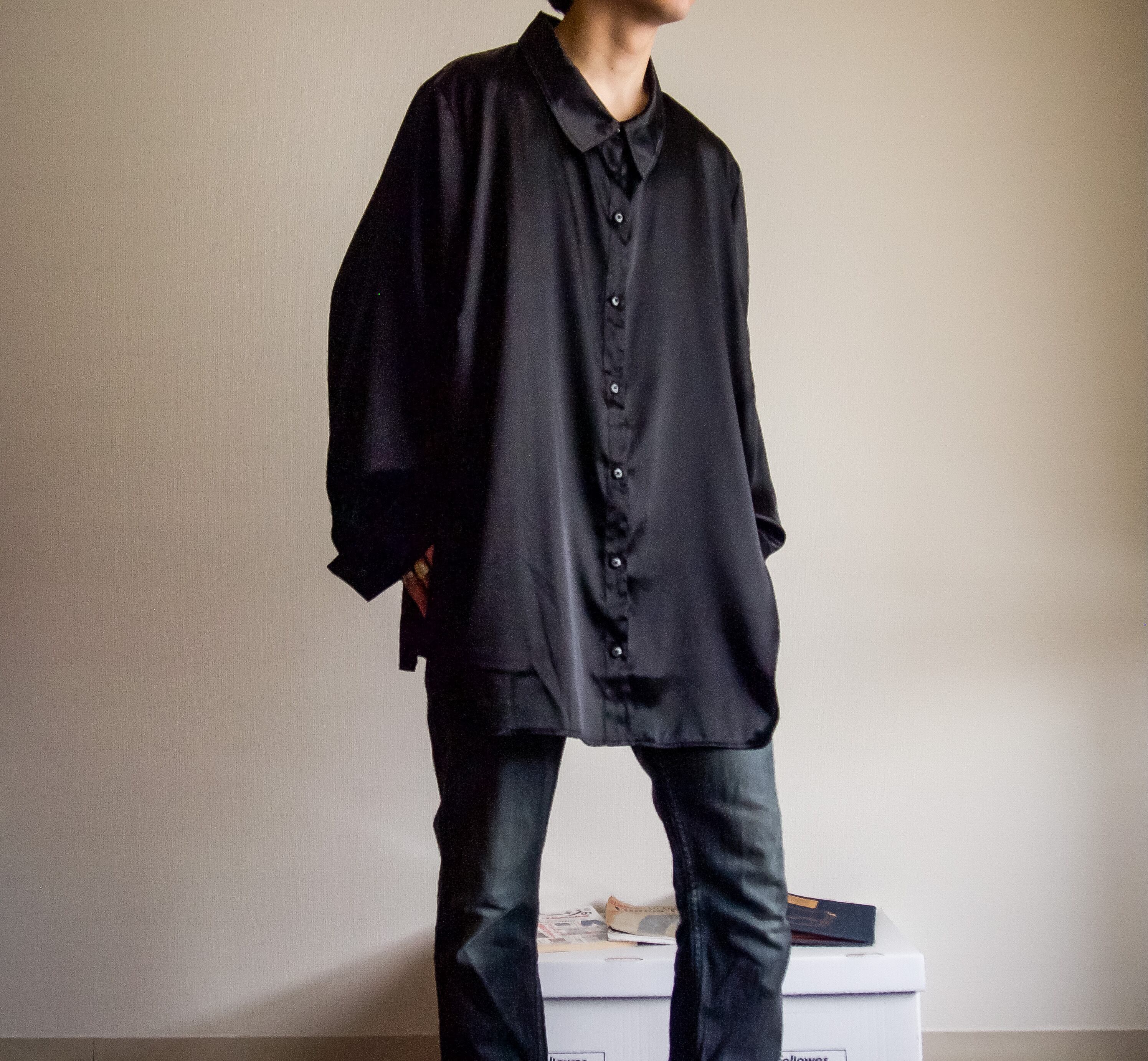 特徴 :光沢感のある絶妙なブラックカラーがクールな珍しいサテンシャツ。