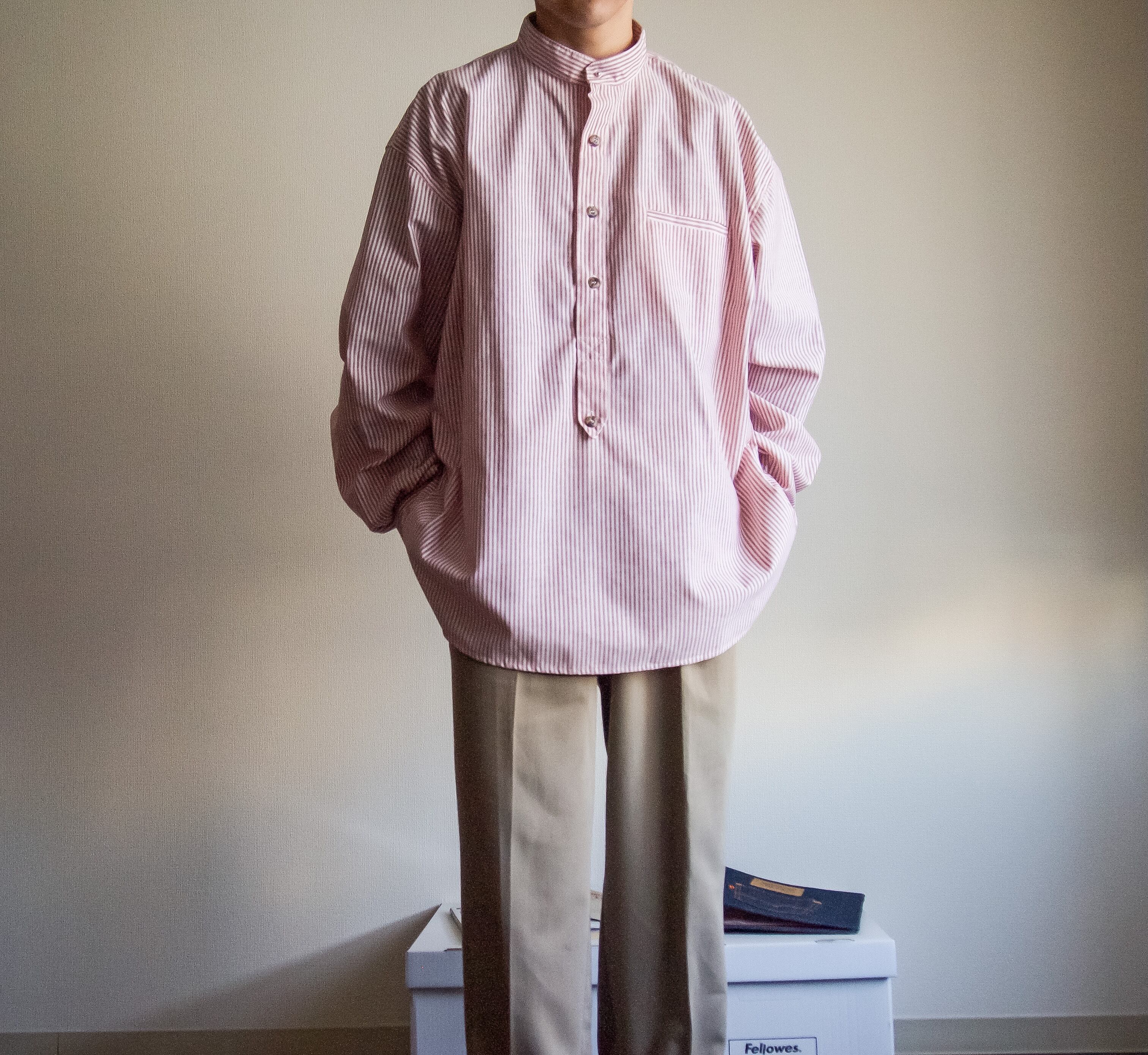 襟周りのスッキリとしたバンドカラーで、トップはカフスに付くようなボタン留めになっているのも良いですね。
