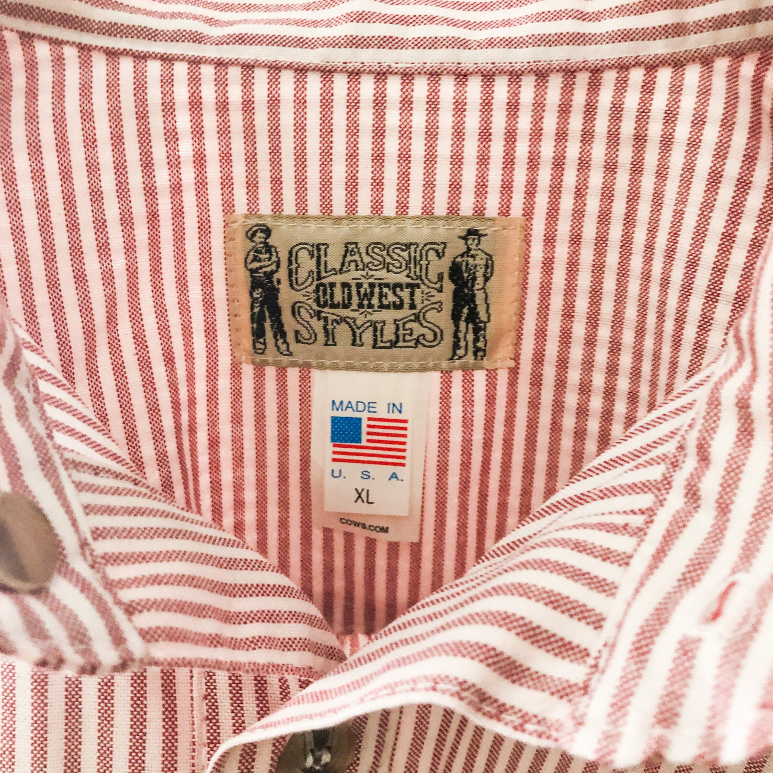 特徴 :ホワイト×レッドカラーの爽やかなストライプ柄のスモックシャツ。