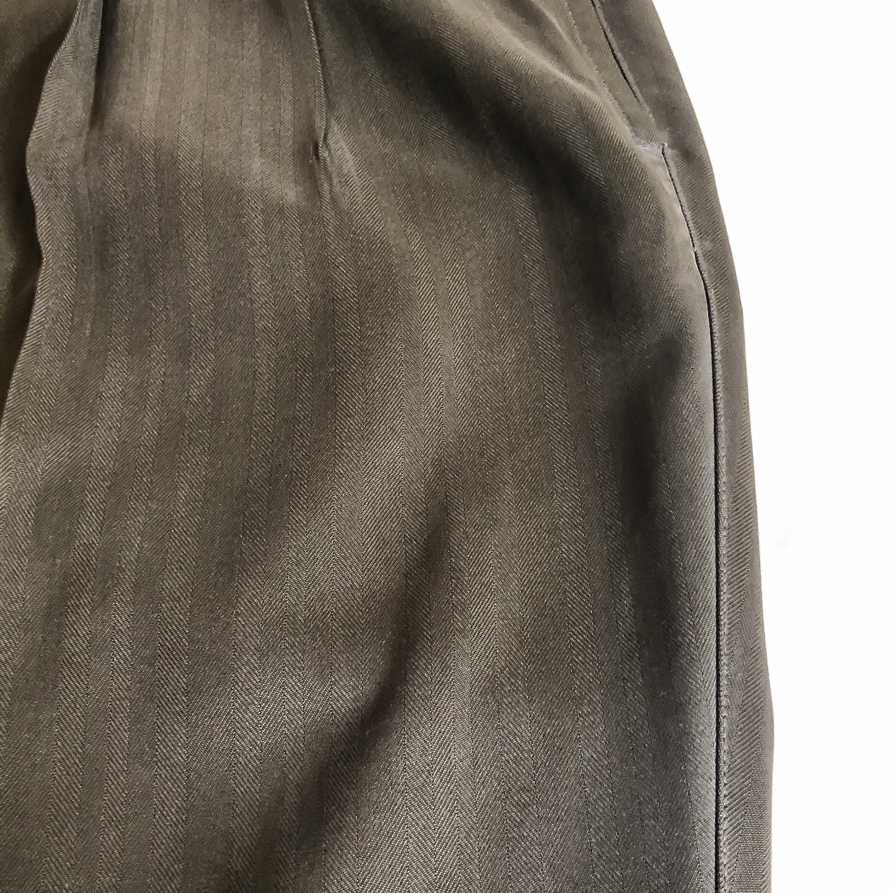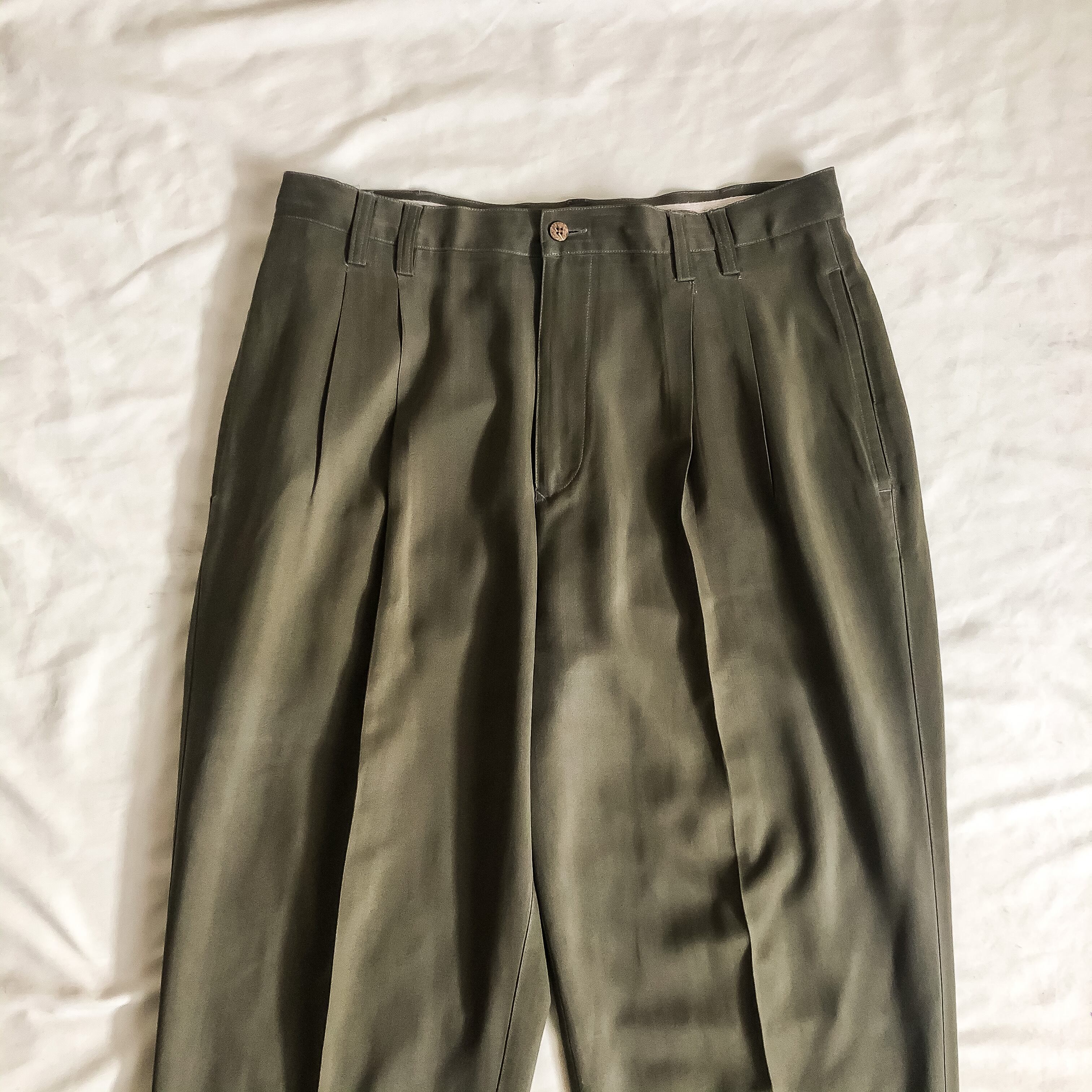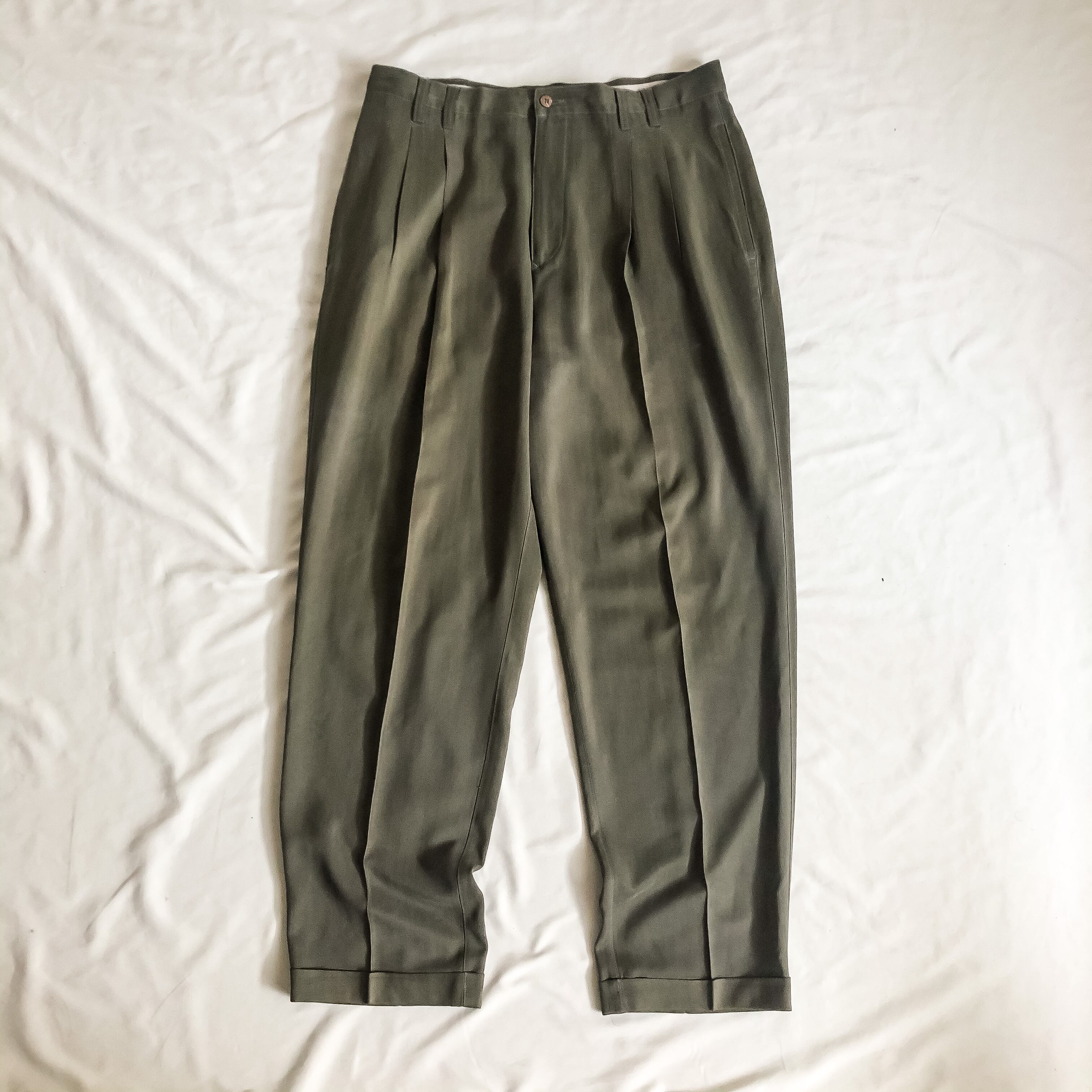 特徴 :少し光沢感のある絶妙なオリーブ系のカラーが独特な表情を醸し出してくれるクールなシルクスラックス。