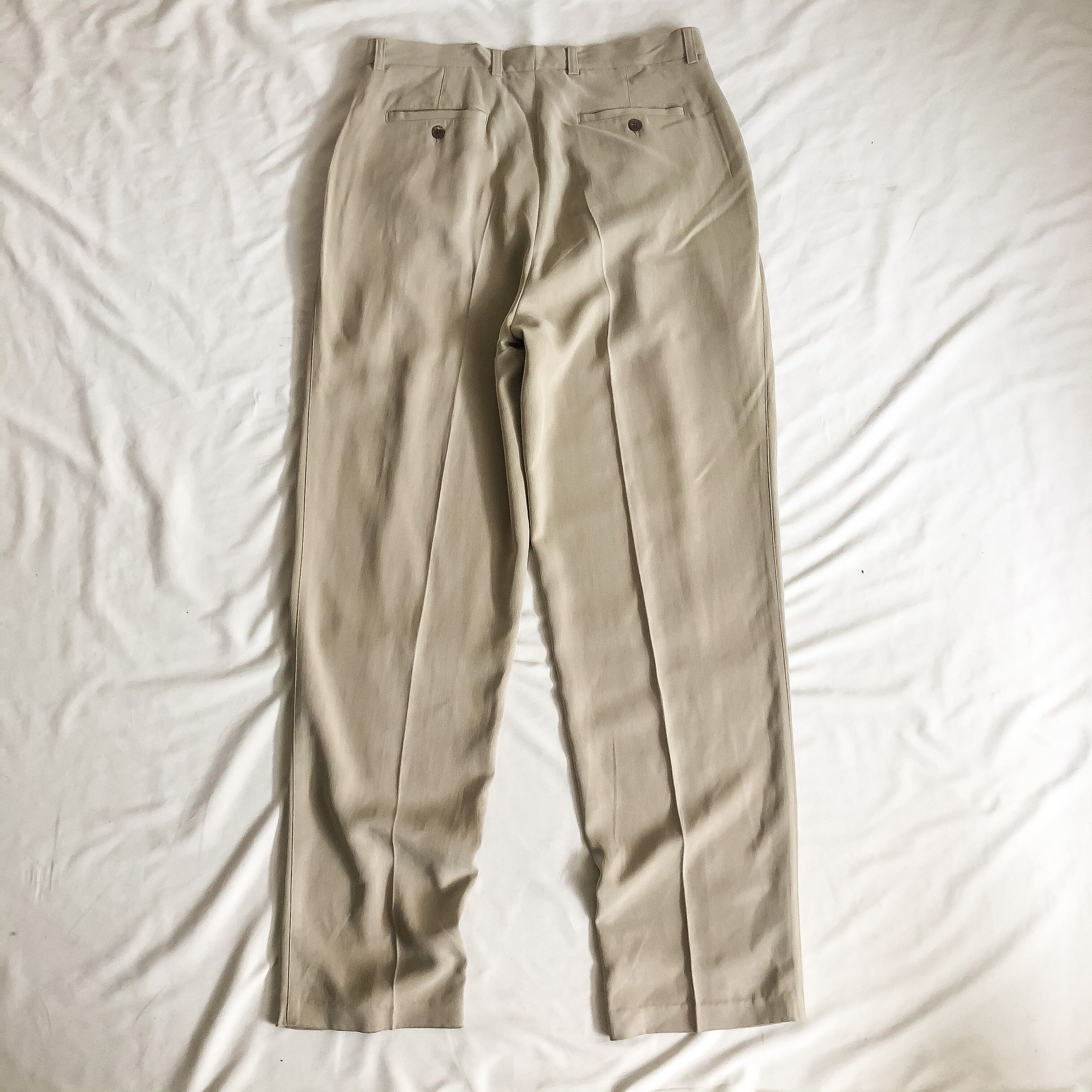 特徴 :光沢感のある絶妙なベージュカラーが独特な表情を醸し出してくれるクールなシルクスラックス。