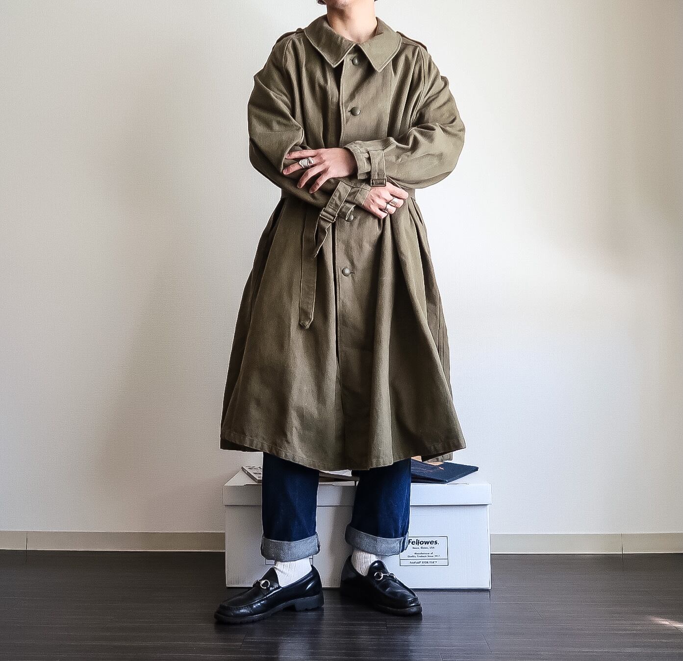 フランスらしい少し丸みのある大きな襟に、体のラインに自然に沿って落ちてくれる美しいラグランスリーブ、オーバーコートならではなロングな丈と身幅のたっぷりとしたワイドなAラインシルエットは雰囲気抜群。