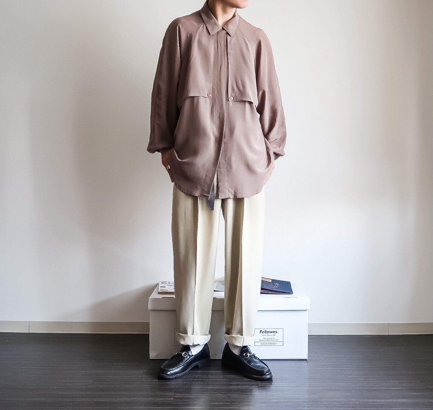特徴 :ダブルマッキーノジャケットのようなデザインになった非常に珍しいデザインのシルクシャツ。