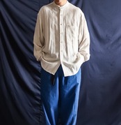 1990's~ ivory stripe pattern linen cotton band collar shirt