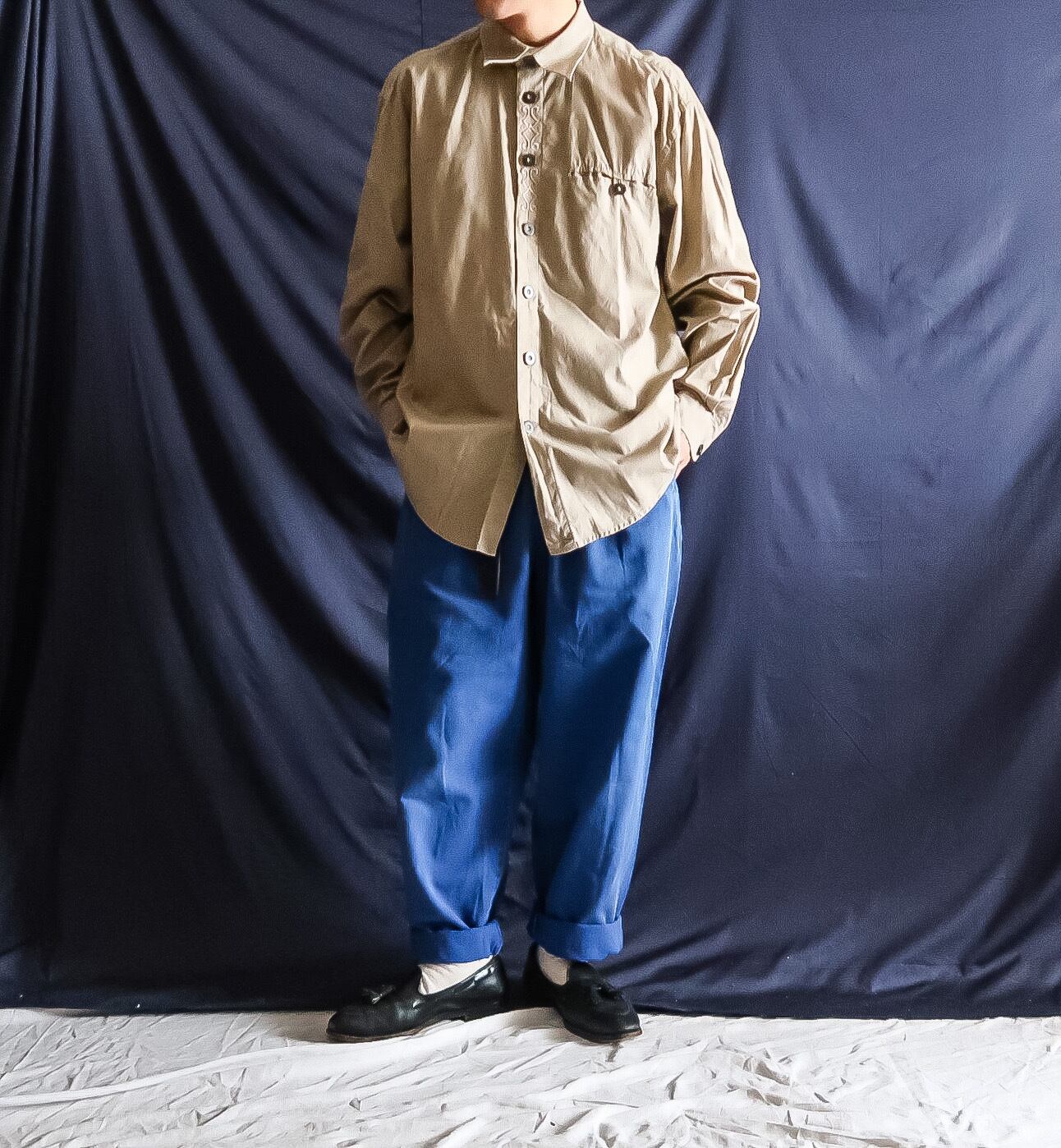 オーストリア、チロル地方の民族衣装を元にアレンジされたシャツで、独特なデザインが現代的な服のデザインとは異なる特徴的なデザイン。