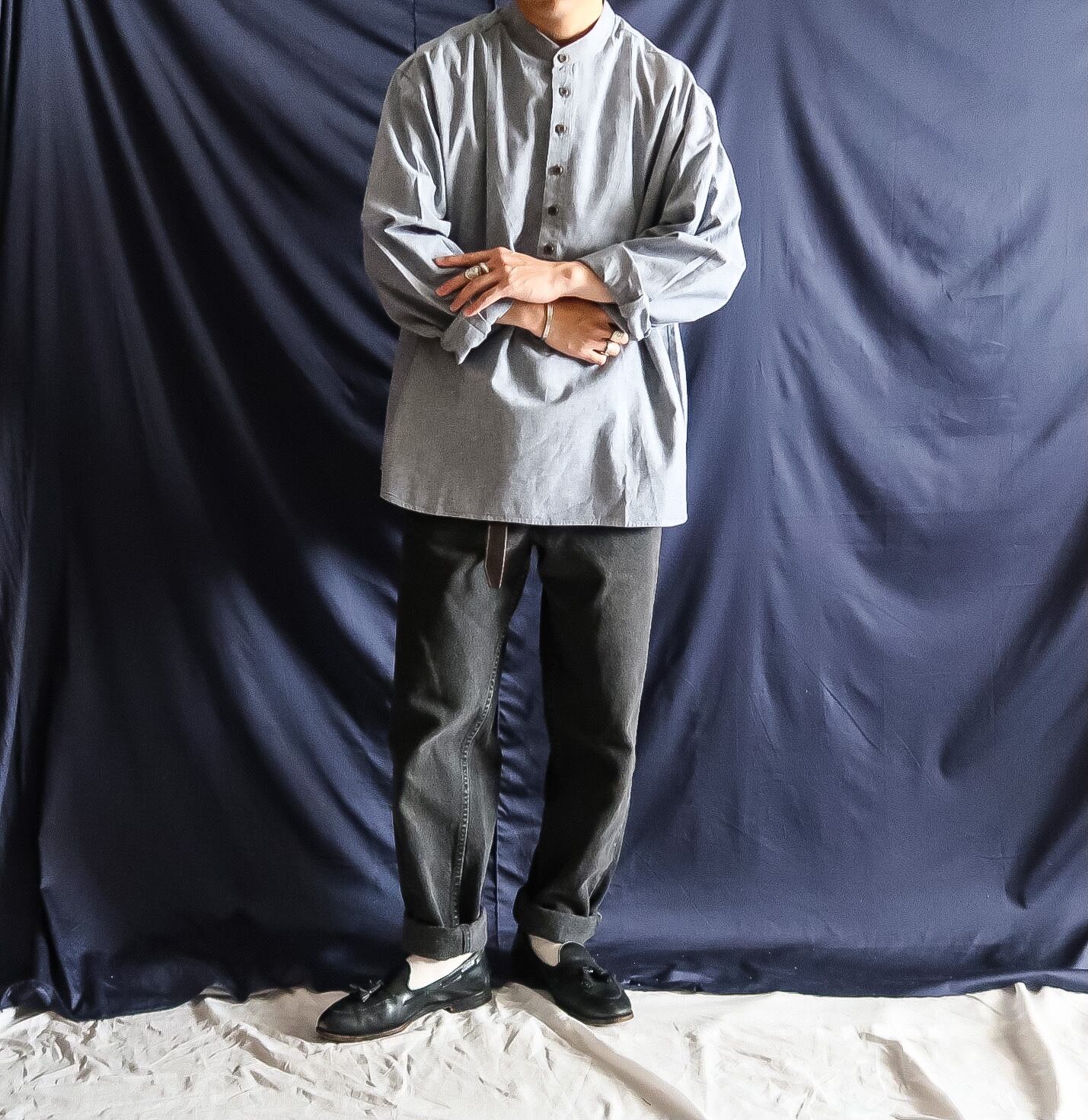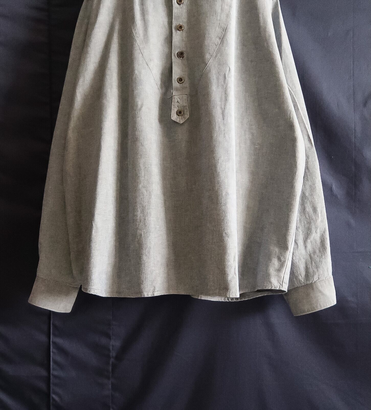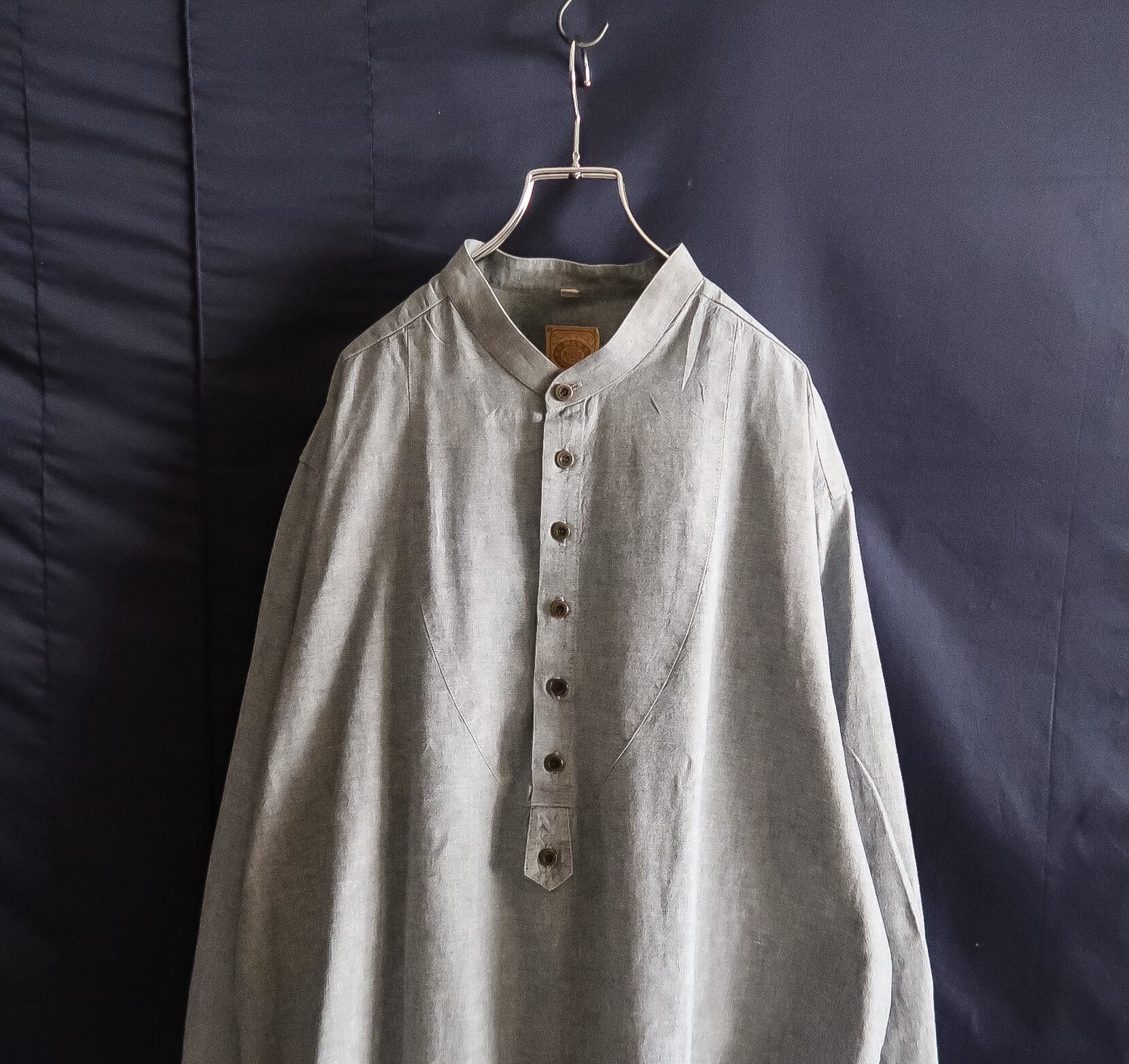 特徴 :グレーボディーに襟周りのスッキリとしたバンドカラーのFRONTIER CLOTHINGのスモックシャツ。