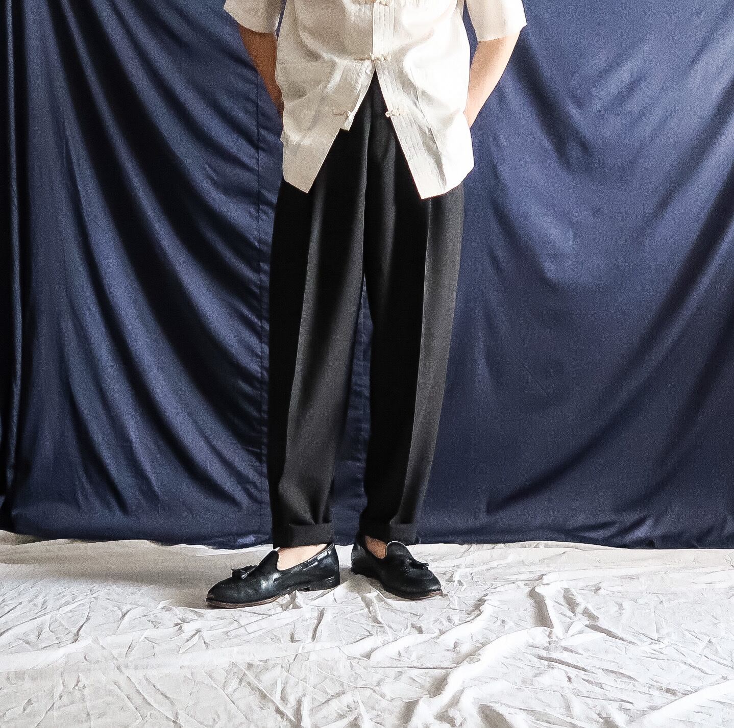 ツータックで太もも周りはゆったり股上は深めで、裾にかけてしっかりとテーパードのかかる綺麗なシルエット。