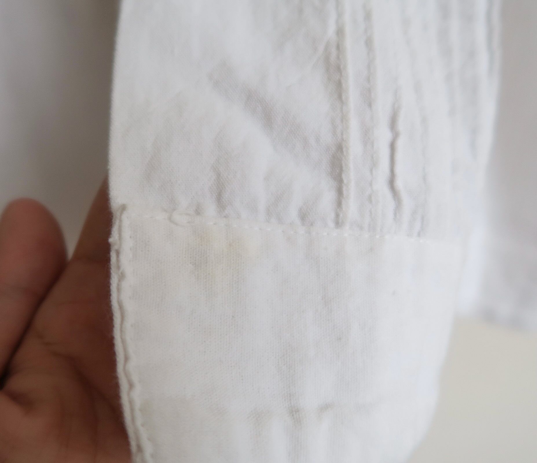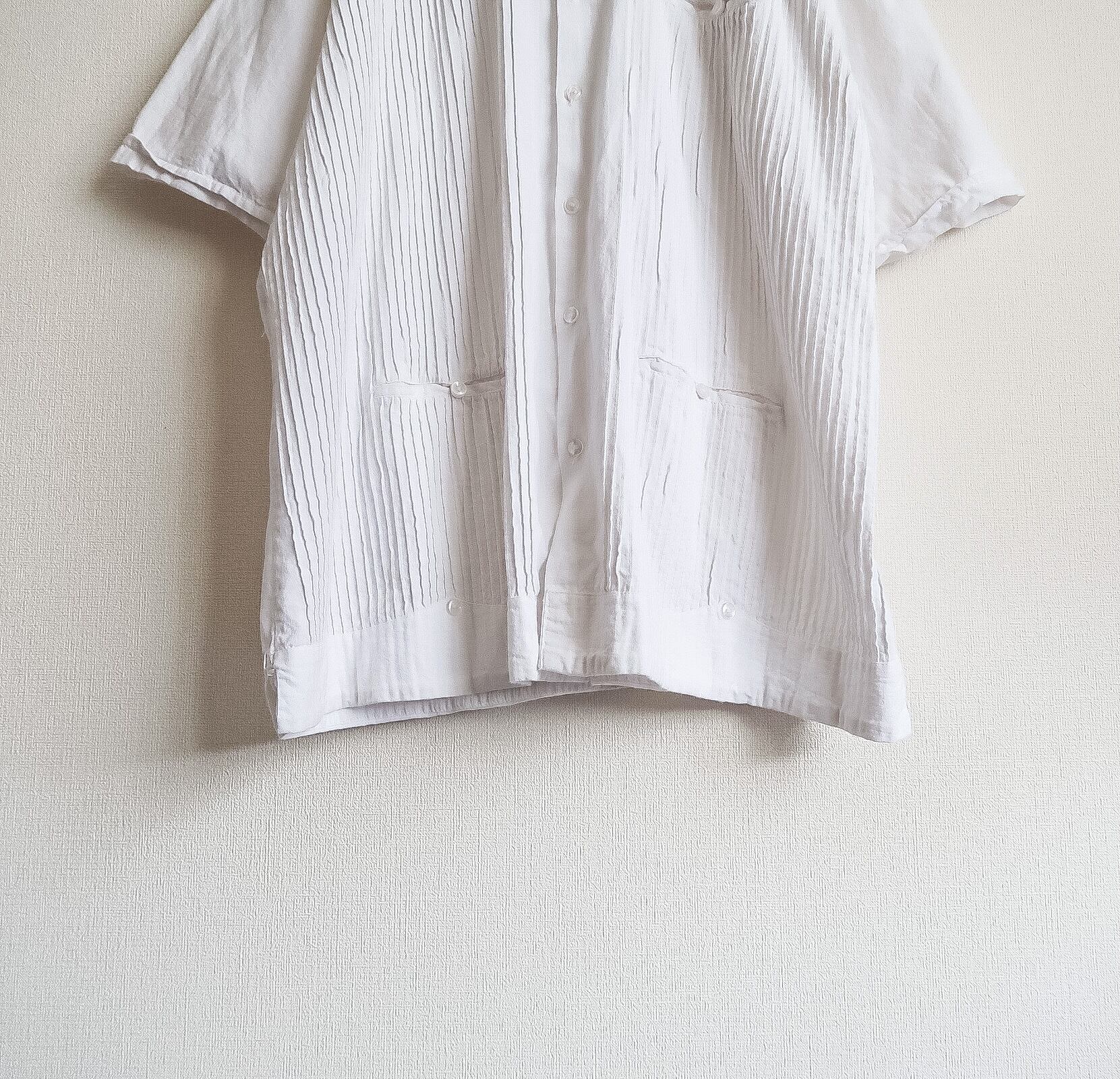 特徴 :爽やかなホワイトカラーにウエスタンシャツのような湾曲したヨークデザインとプリーツのデザインが洒落た1970's~頃の半袖シャツ。