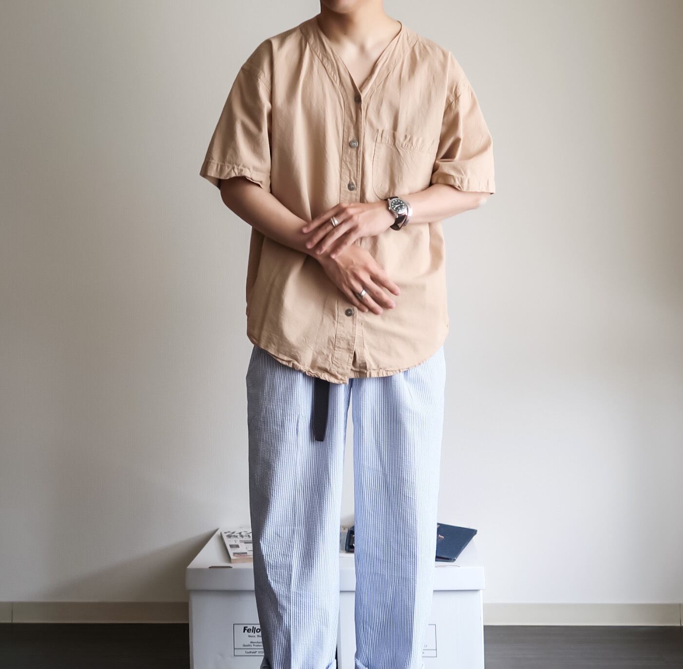 特徴 :少しオレンジが混ざったような絶妙なベージュカラーのノーカラーシャツ。