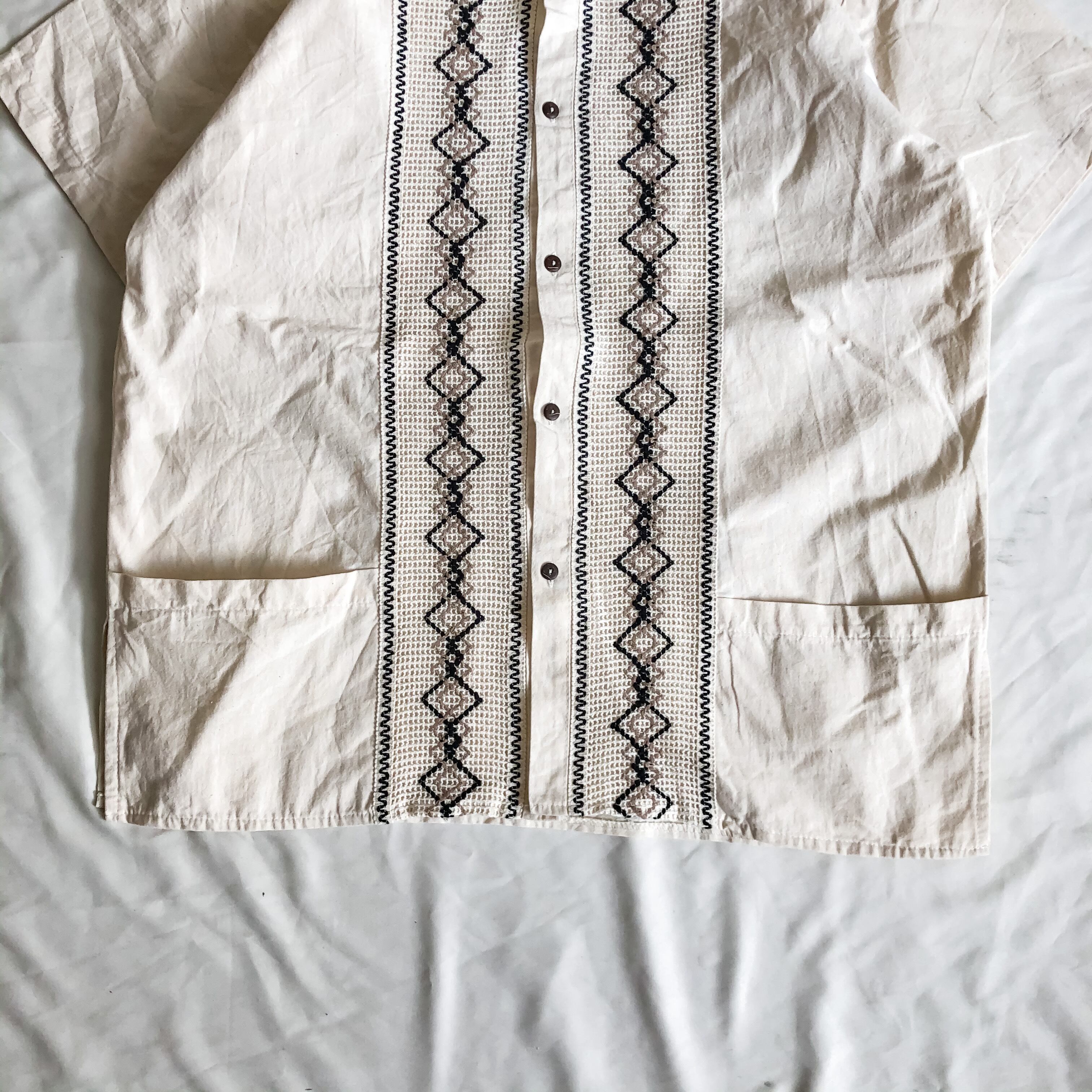 1980's~1990's ecru color embroidery design band collar s/s shirt