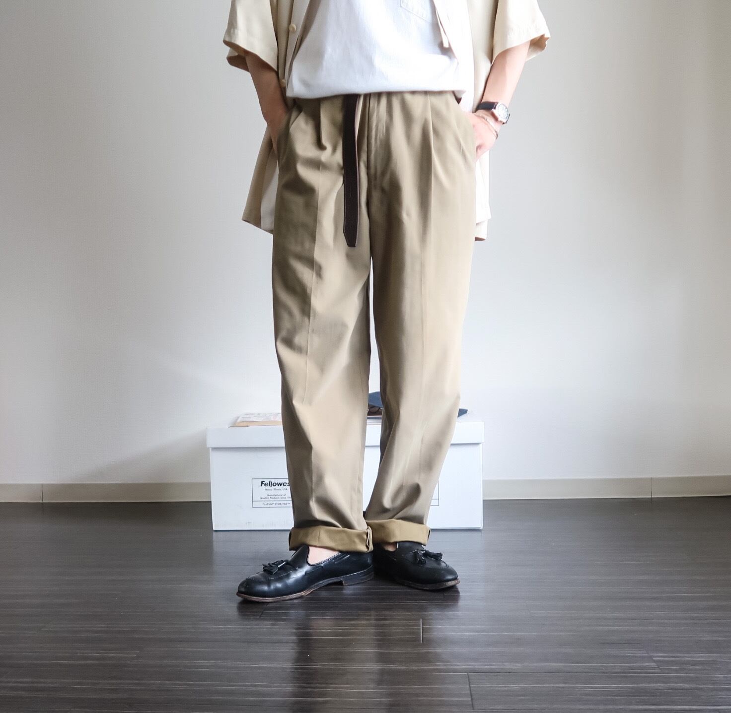 ツータックで太もも周りはゆったりし、裾にかけて少しテーパードのかかるシルエットの一本。