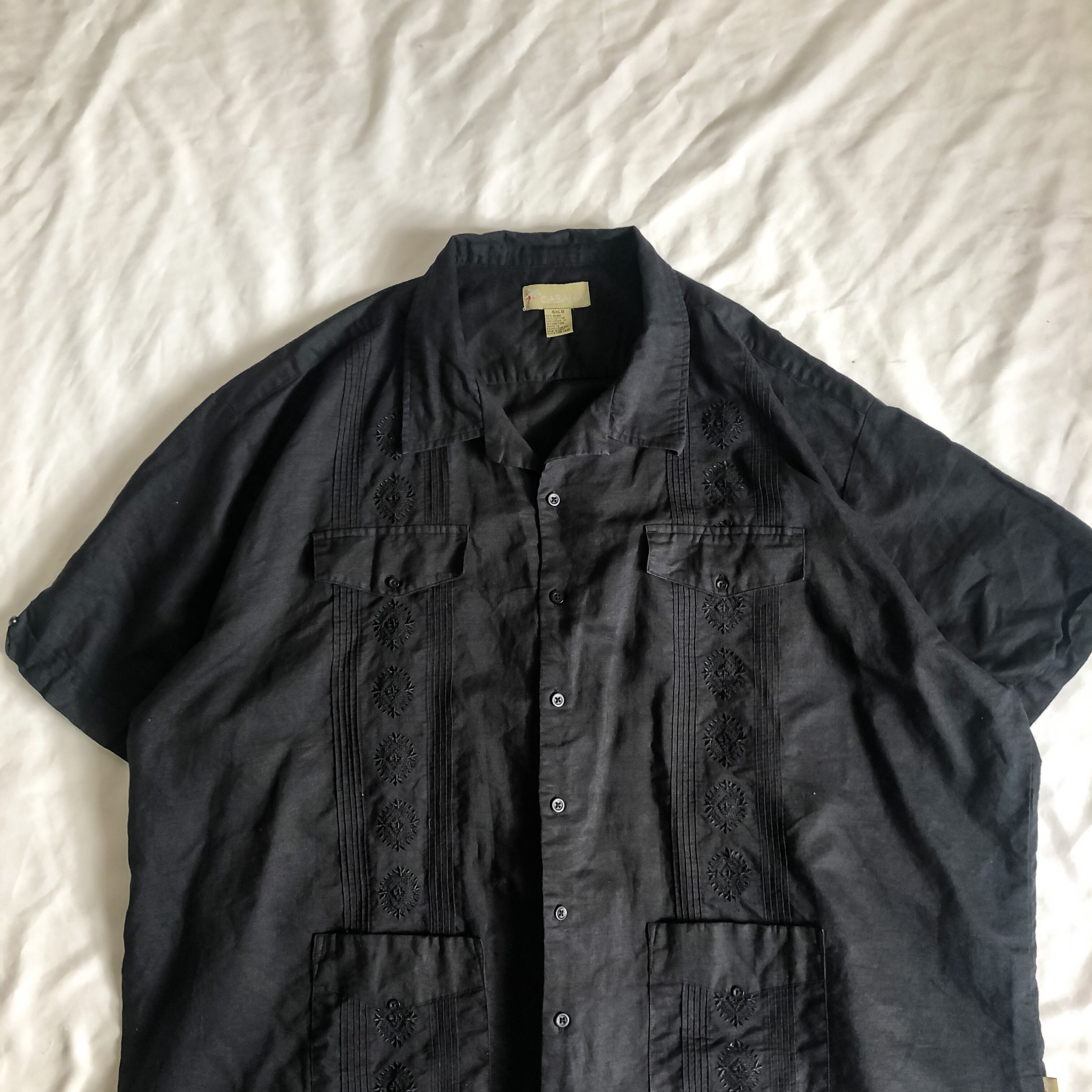 1990's~ super bigsize black ramie×cotton open collar cuba shirt