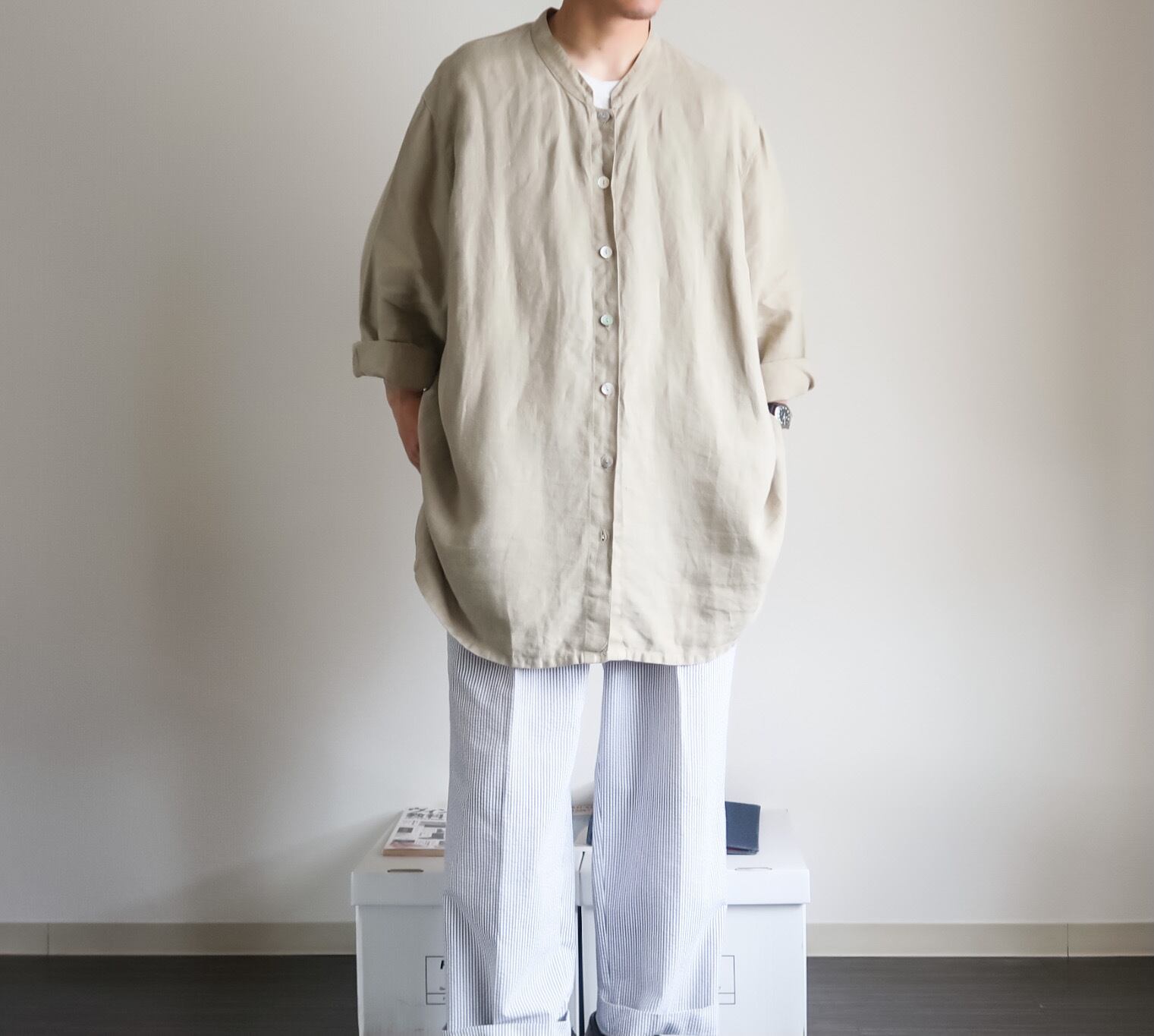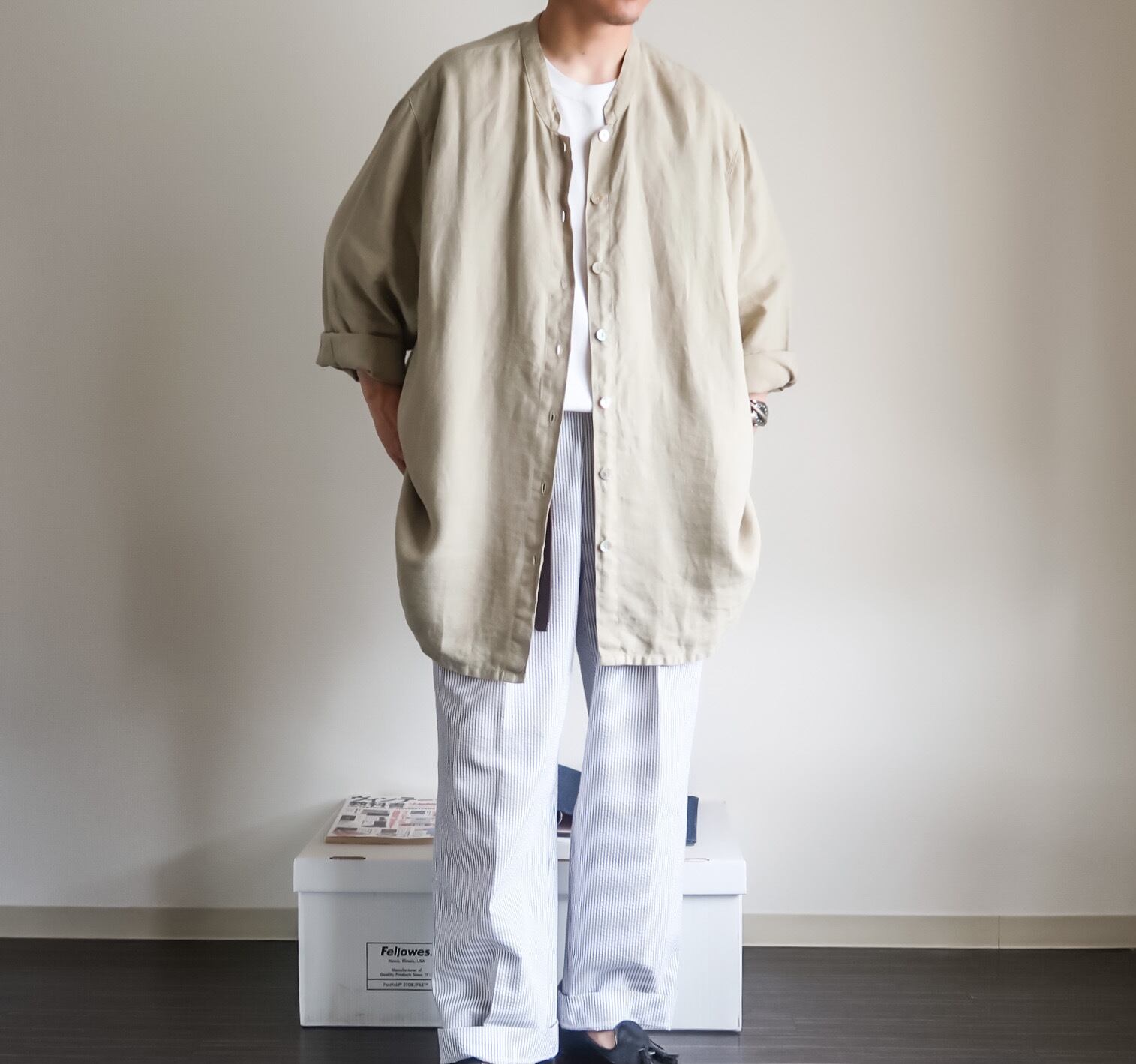 身幅たっぷりな綺麗なオーバーシルエットに、落ち感のあるプルプルとしたリネンのファブリックも最高です。