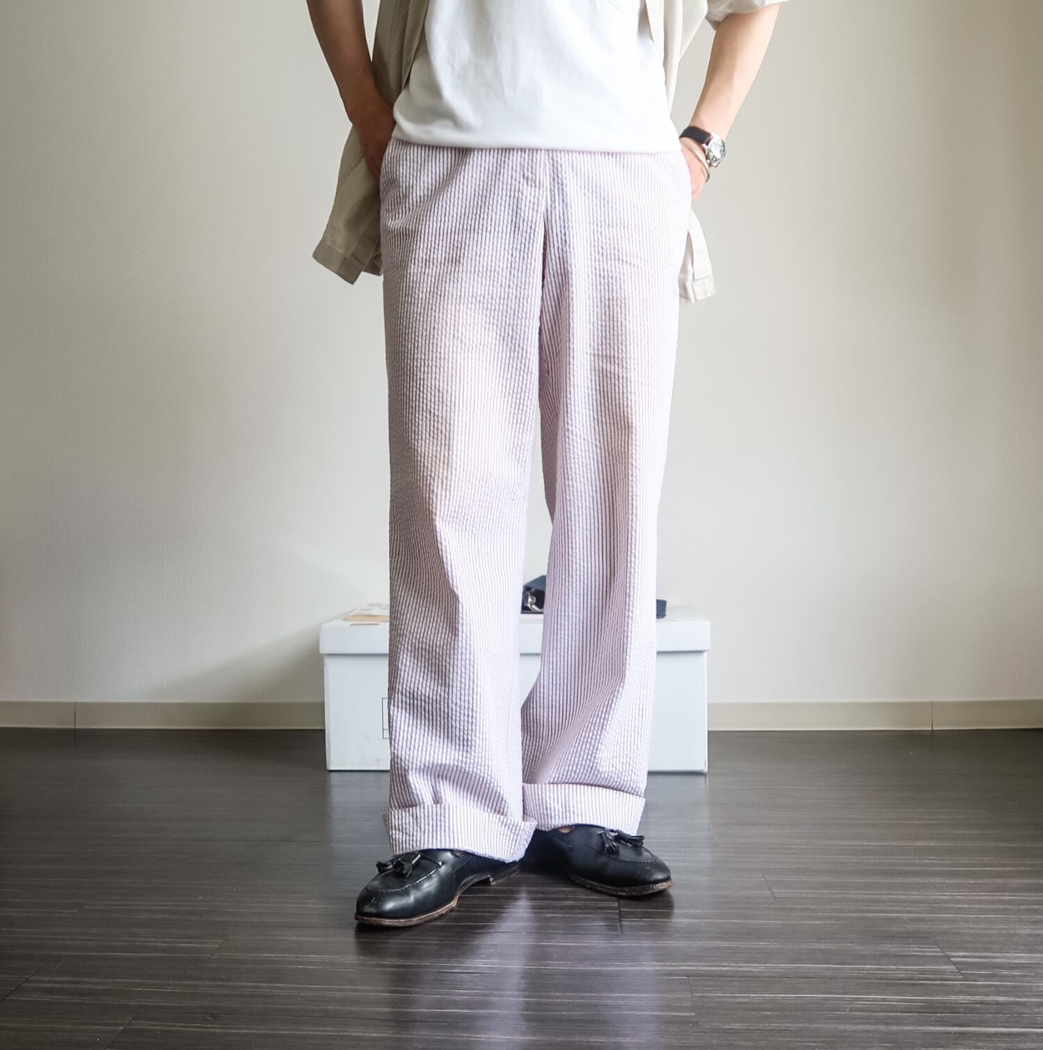 シアサッカーのパンツは大抵がネイビーやグレー×ホワイトですがこちらは珍しいパープル×ホワイト。