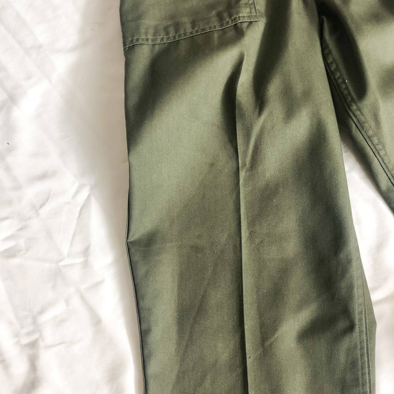 古いオールコットンの物に比べて、こちらはセンタープレスが入り裾にかけて少しテーパードのかかるシルエットも魅力でしょう。