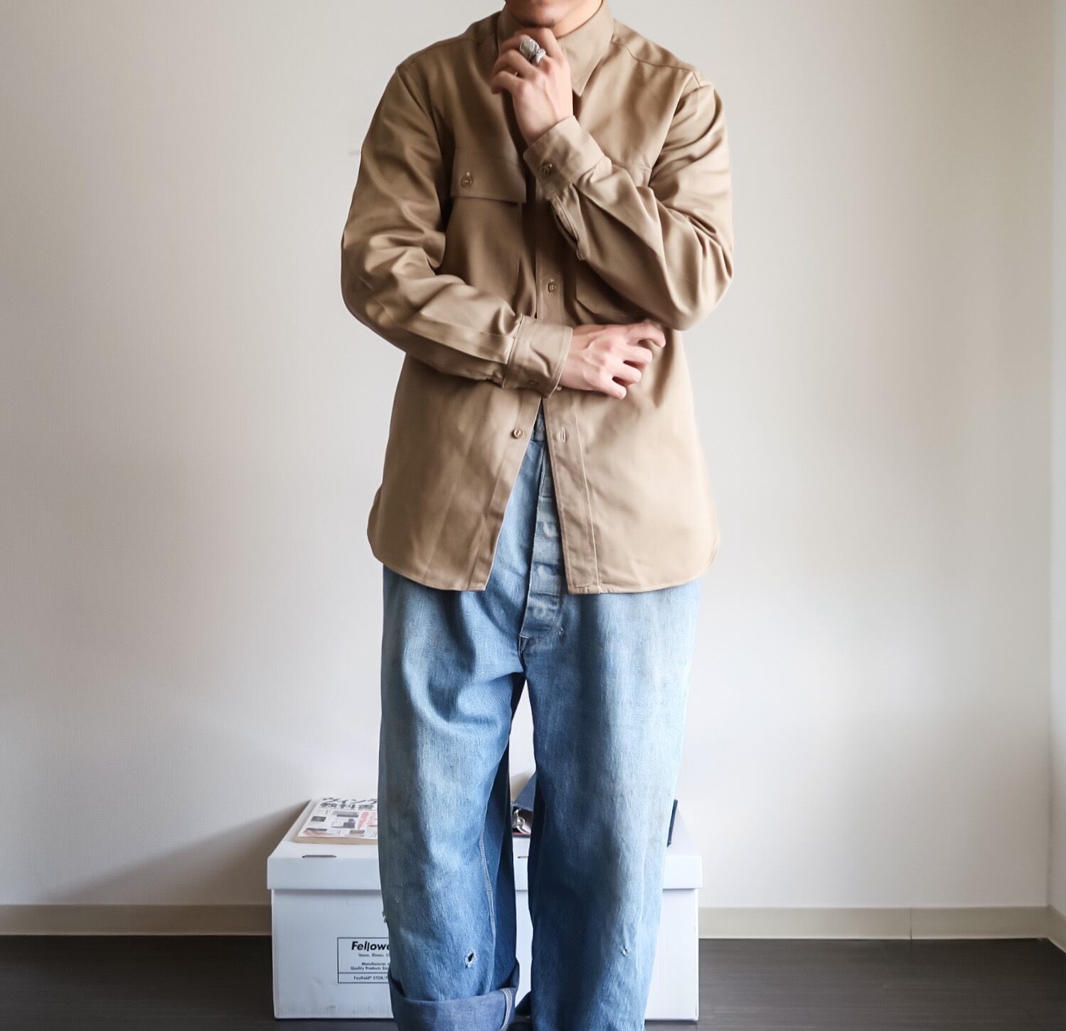 ヴィンテージワークらしいしっかりとしたオールコットン生地に、フラップ付きのツーポケでサイドの裾にはマチも付くディテールも素晴らしいシャツです。