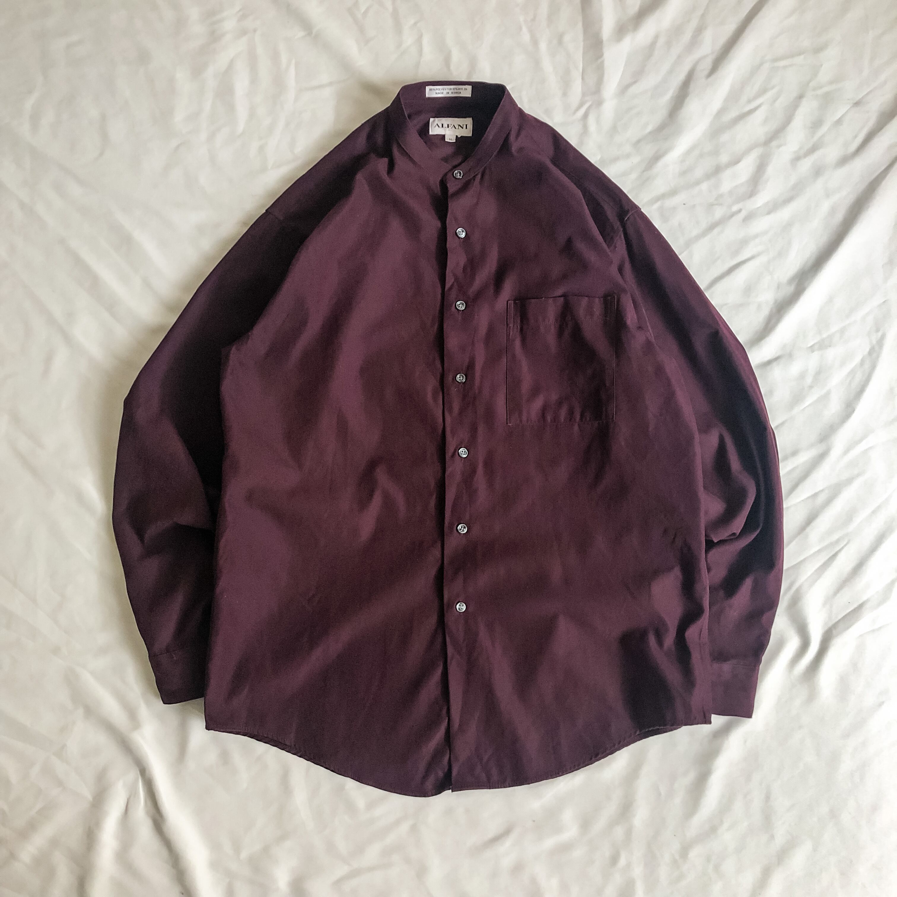 特徴 :よく見ると少し毛羽立ちのあるフェイクスエードのような質感にナイロンが混ざった、少し光沢感のある独特な表情が素晴らしいバンドカラーシャツ。