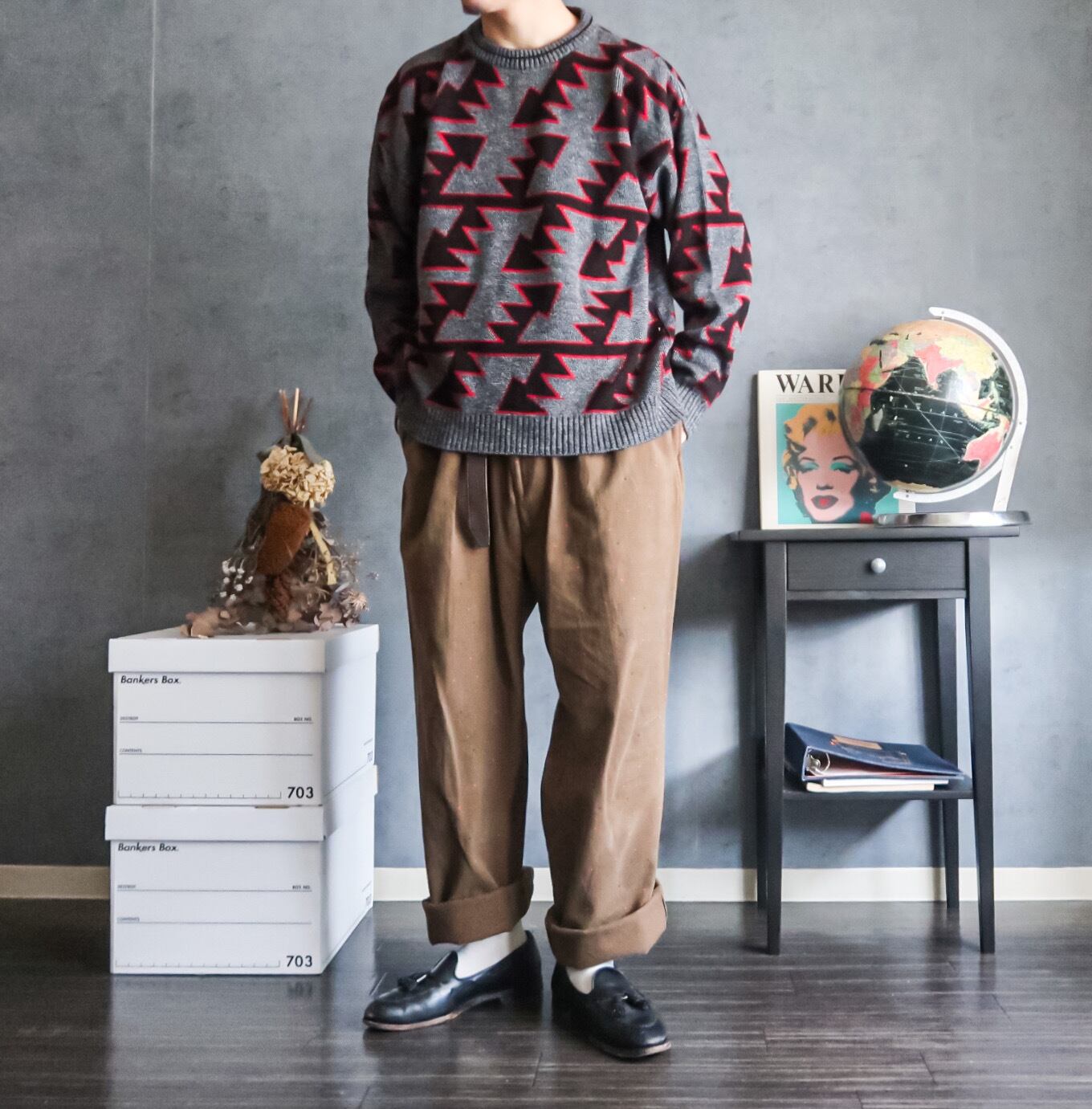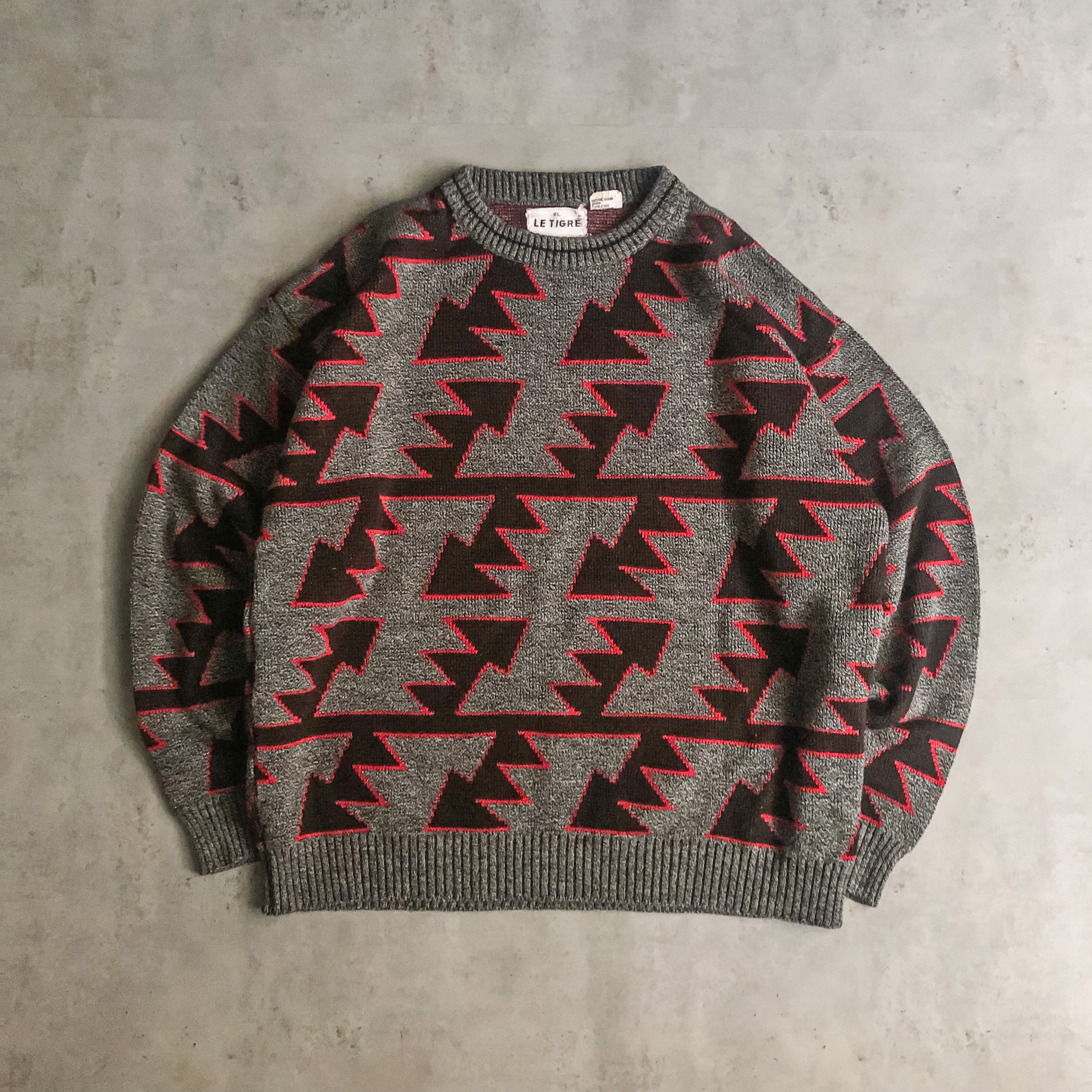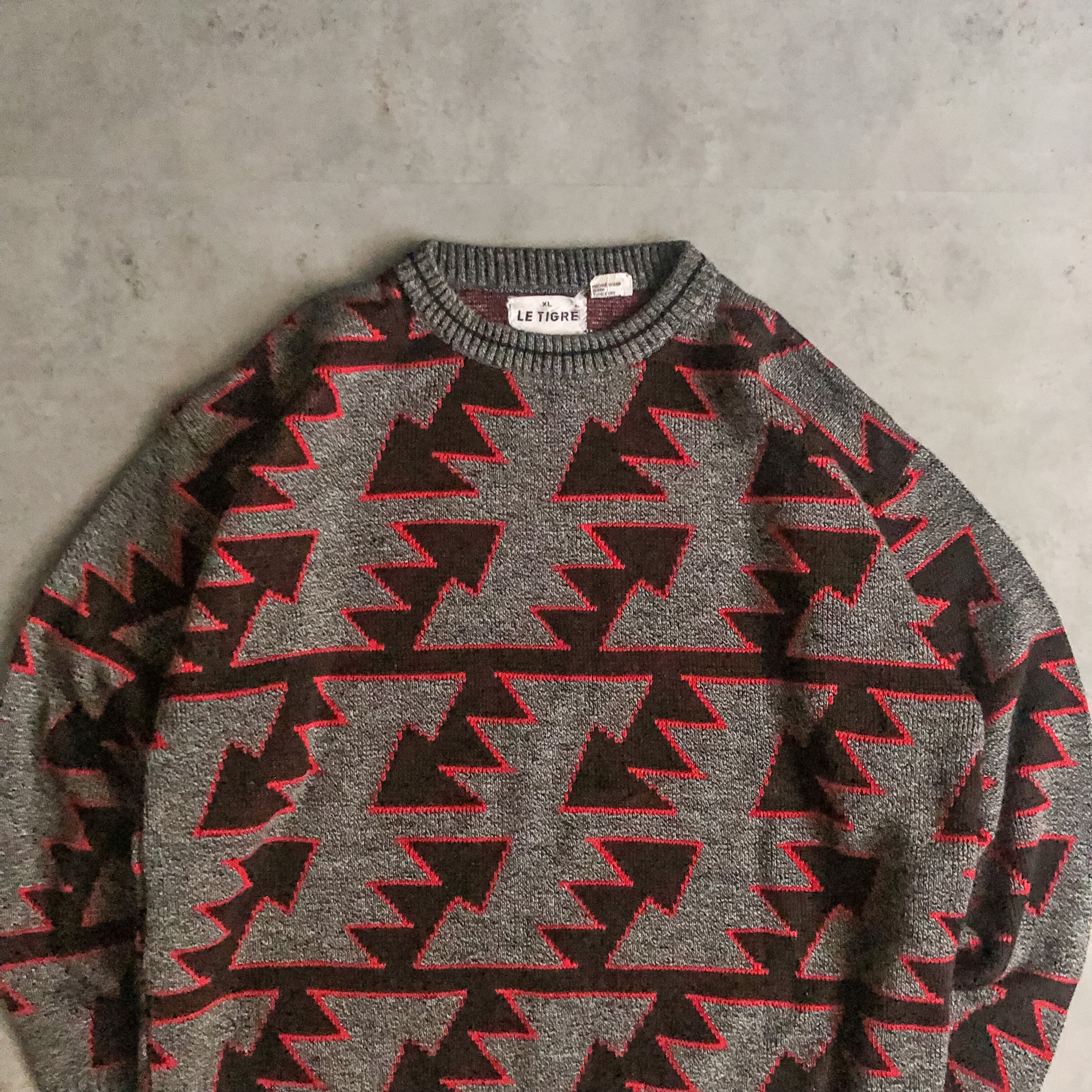 特徴 :どことなくネイティブ柄のような三角形とボーダーのテキスタイルが面白い1980's~頃の総柄セーター。