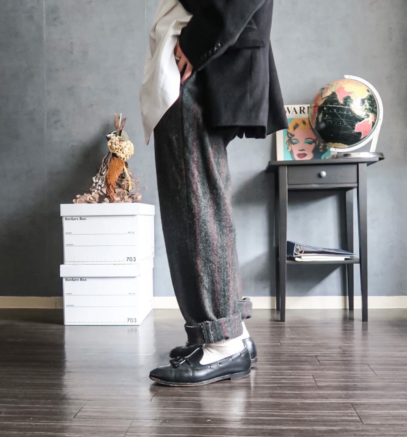 しっかりとした生地感のウールで寒い季節には非常に暖かく過ごす事ができるパンツ。