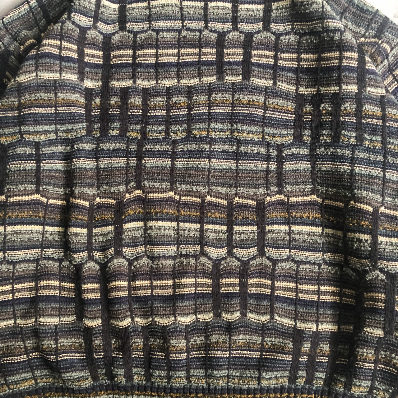 特徴 :ボーダー状に多色の色使いで編まれた1990'sのデザインセーター。