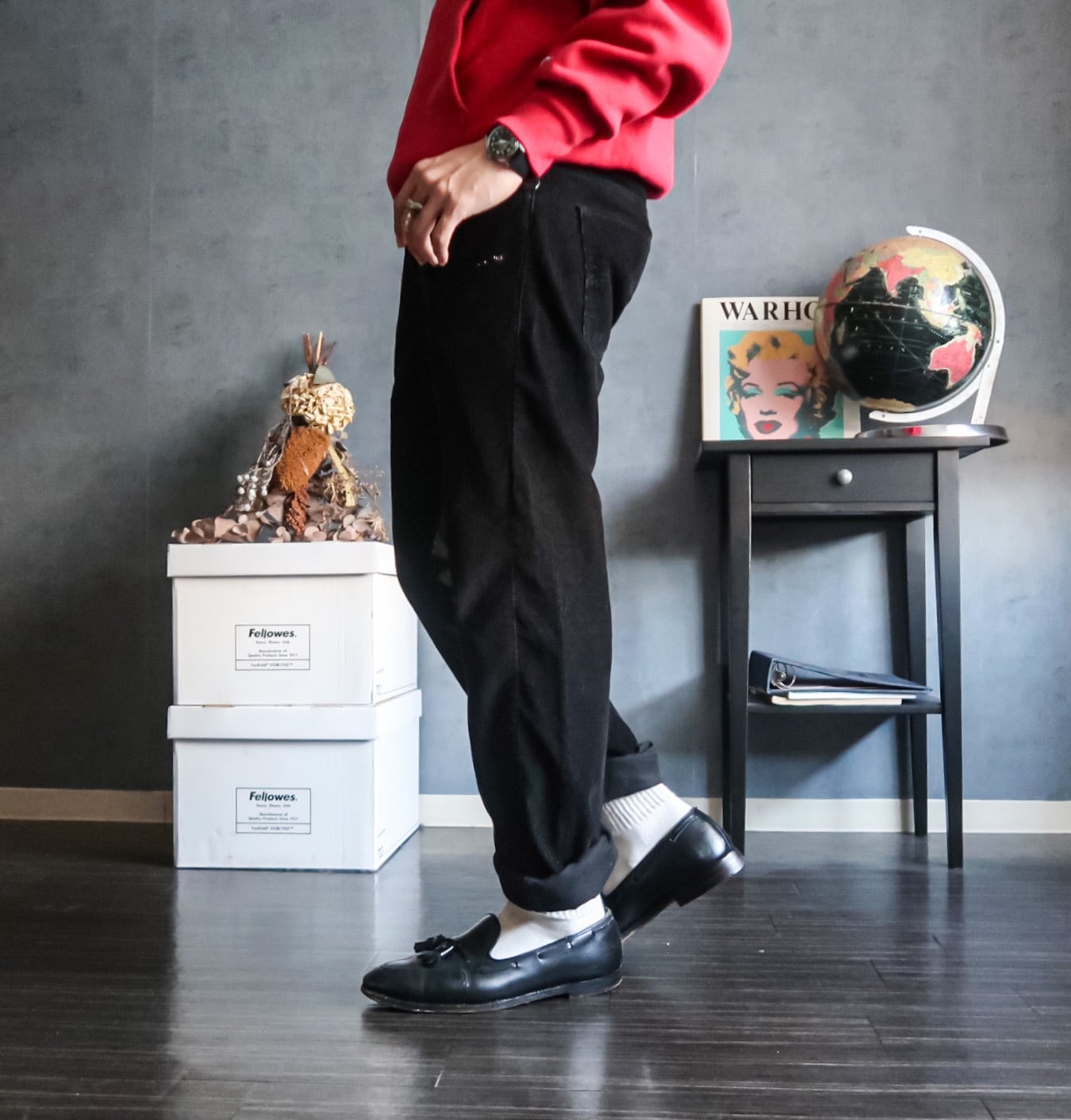 コーデュロイパンツは太めの物が多く、ここまでテーパードのかかったコーデュロイパンツは意外に見かけませんよね。