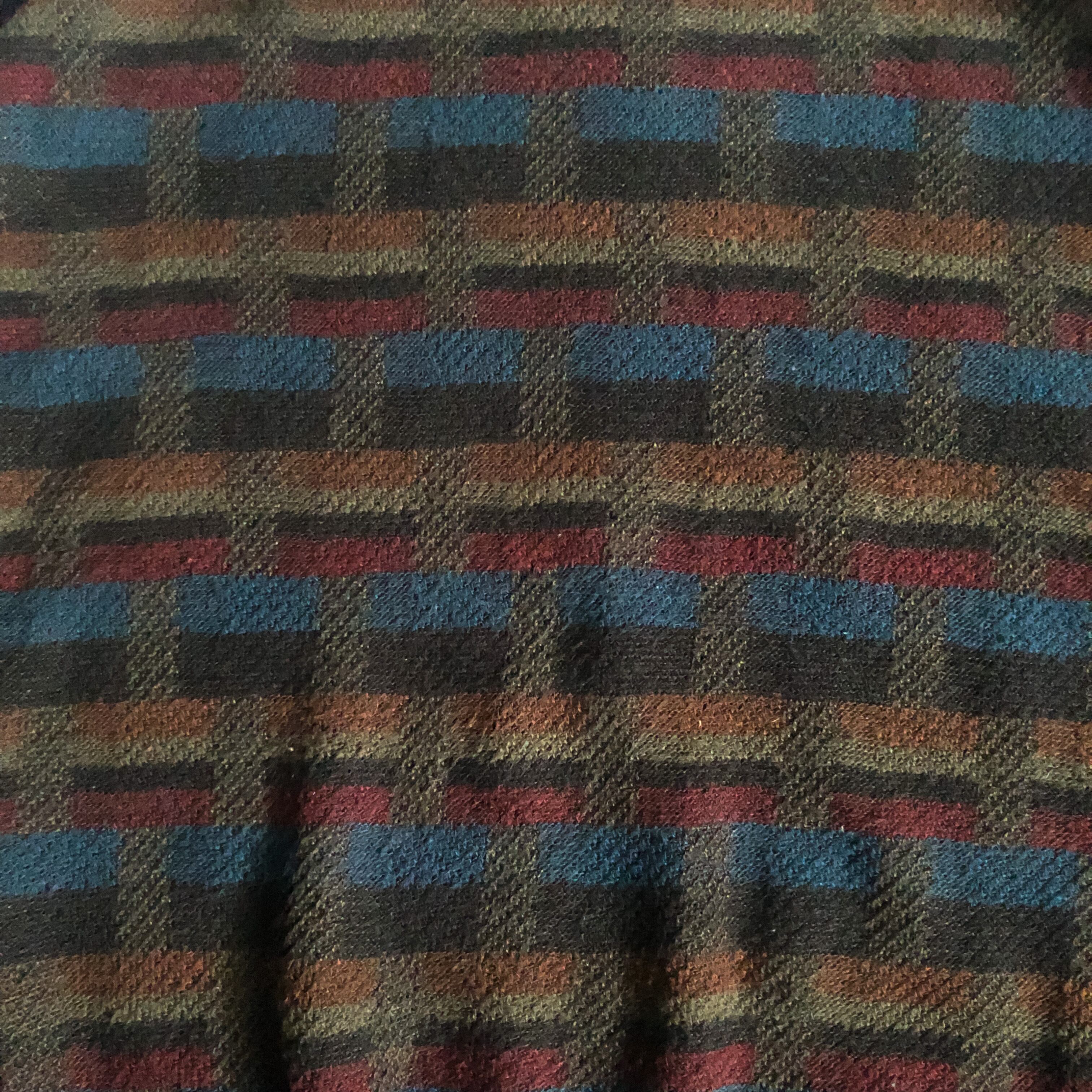 特徴 :遠目から見るとチェック柄のようで、近くで見ると国旗のようなブロック状がボーダー状に並ぶ、面白いテキスタイルの1990'sのデザインセーター。