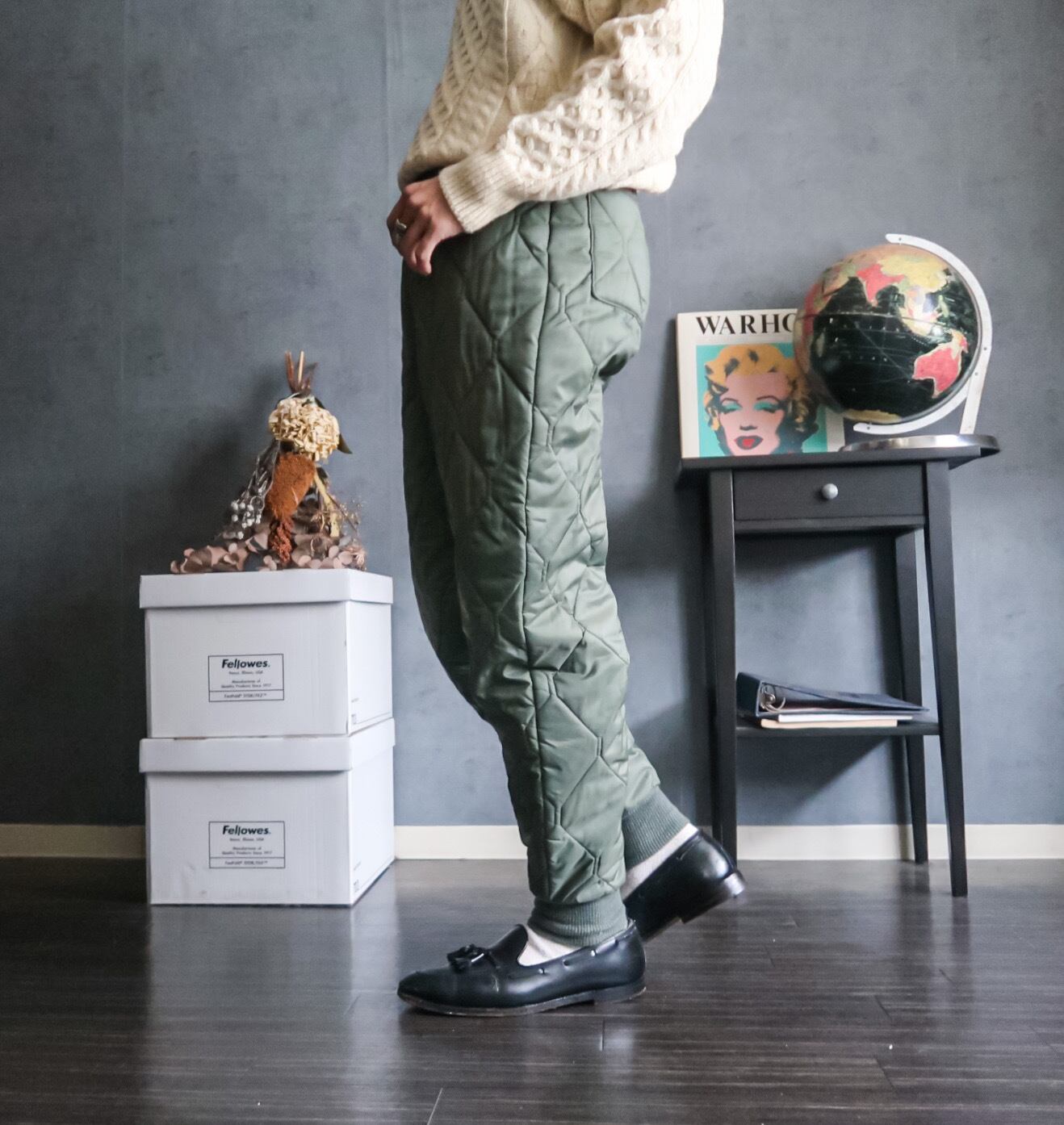バックポケット付きでタウンユースでもしっかりとハマるキルティングパンツですね。