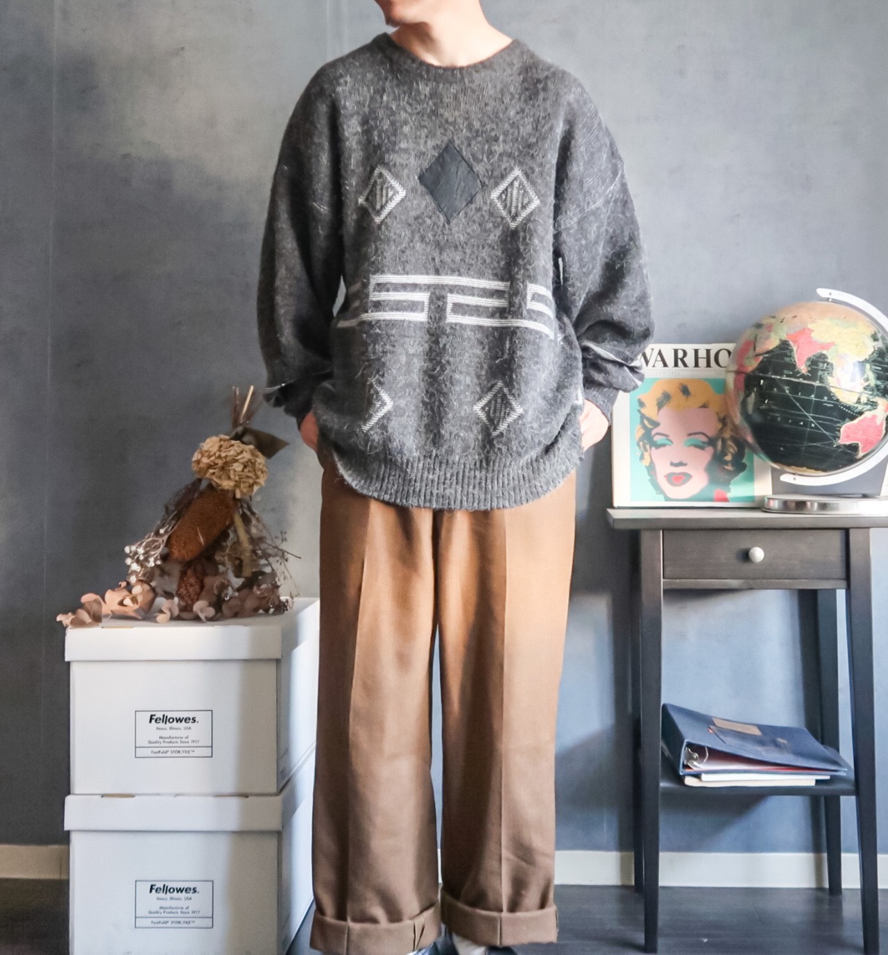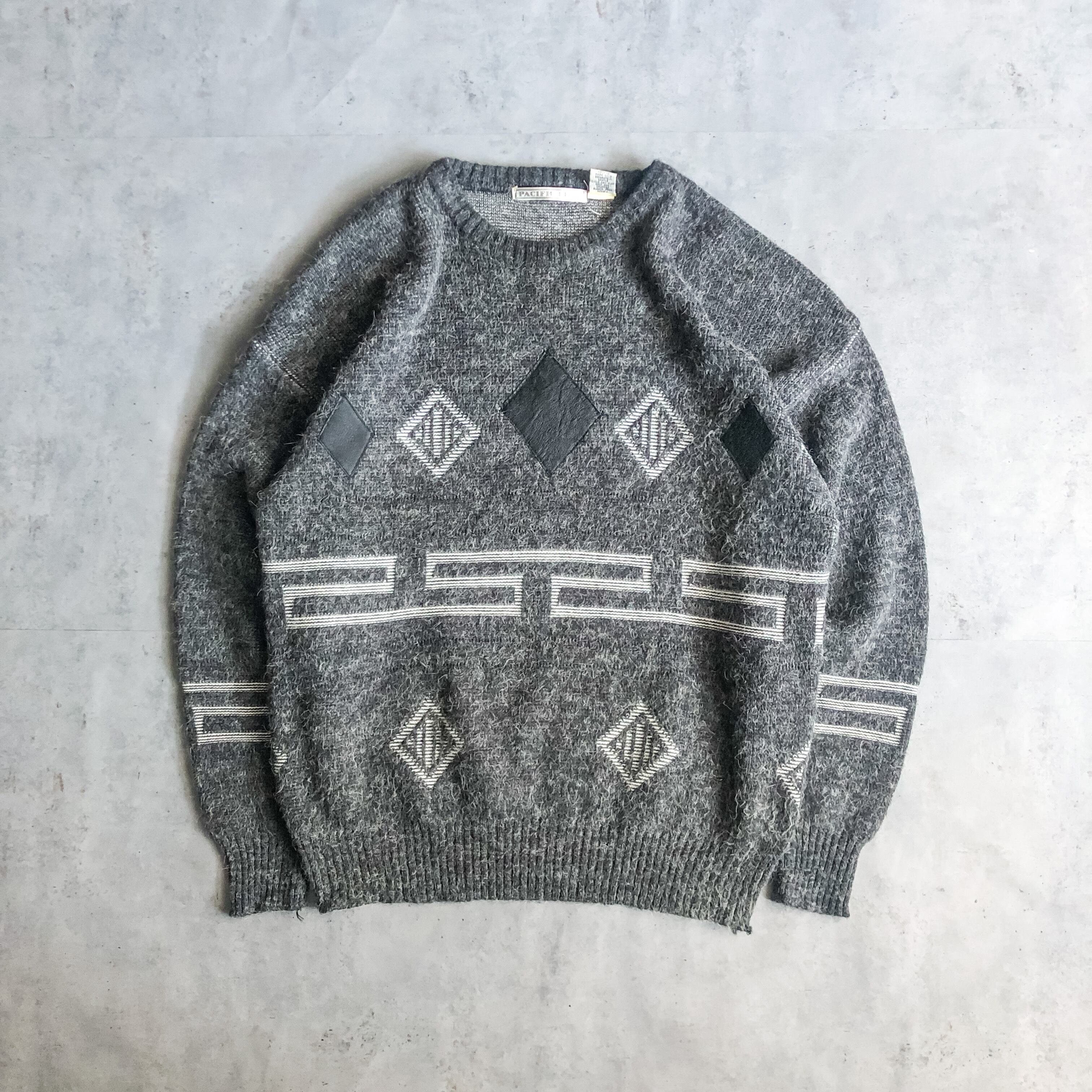 特徴 :独特な総柄のテキスタイルとレザーのパッチワークデザインが素晴らしい1990's頃のデザインセーター。