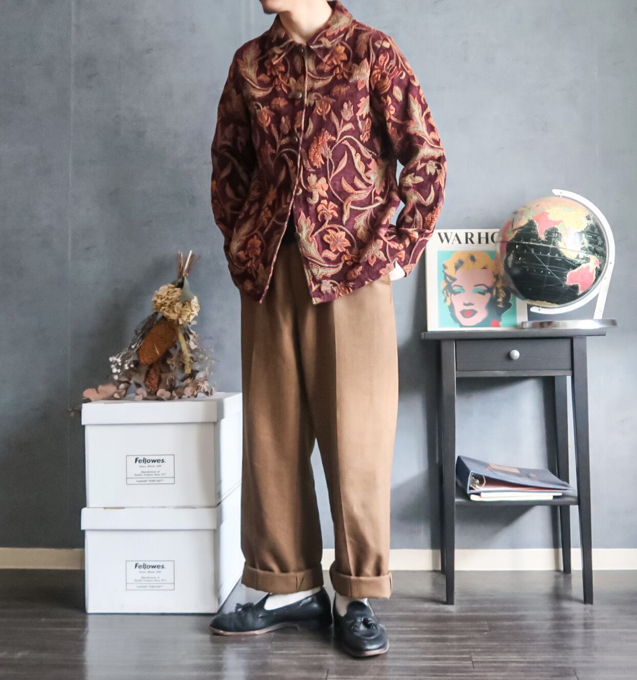 特徴 :渋みのあるカラーリングに草木や葉っぱなどのボタニカル柄の総柄になったタペストリーデザインジャケット。