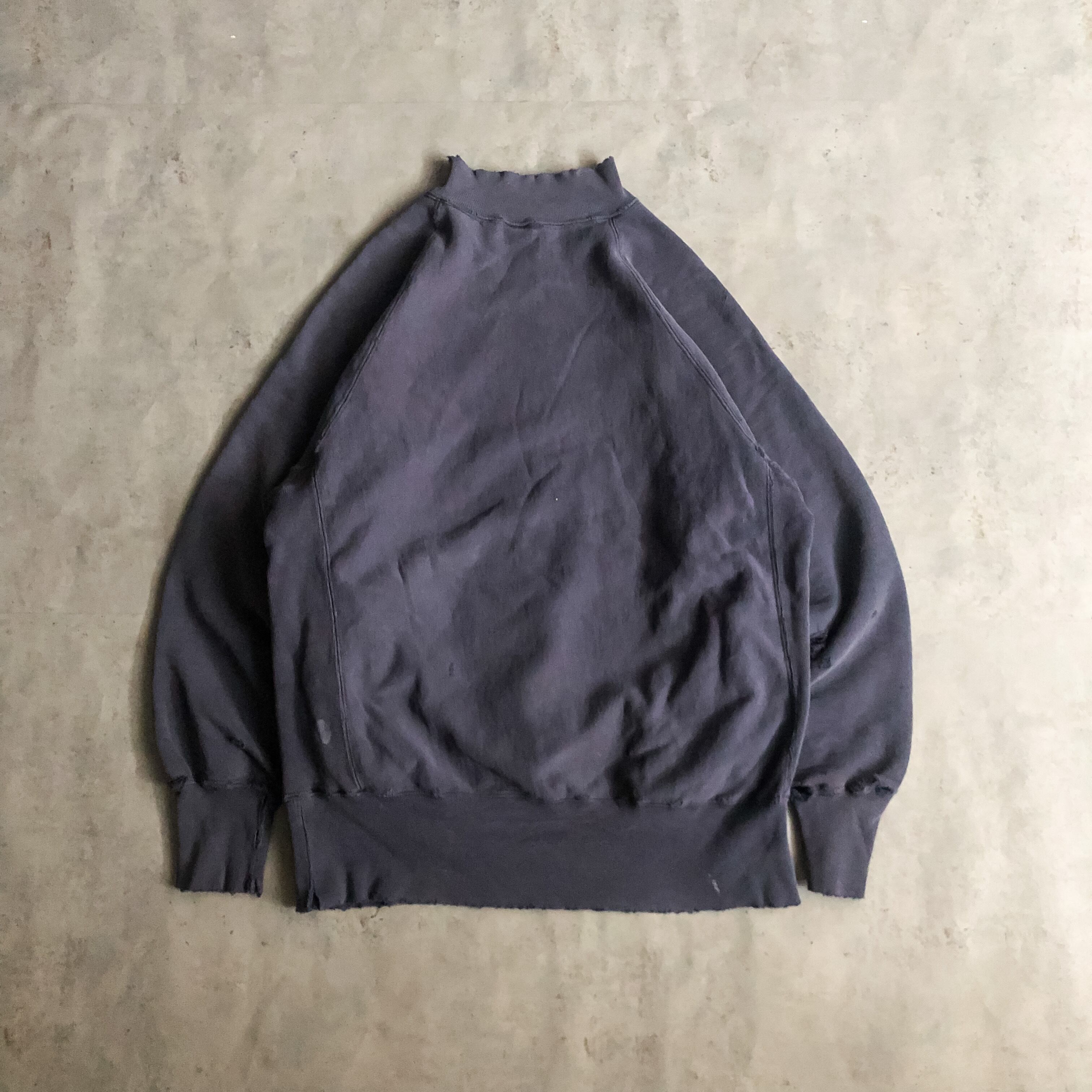 少し退色したナス紺系のカラーリングに、珍しいモックネックにポケットの付く珍しいディテールのリバースウィーブです。