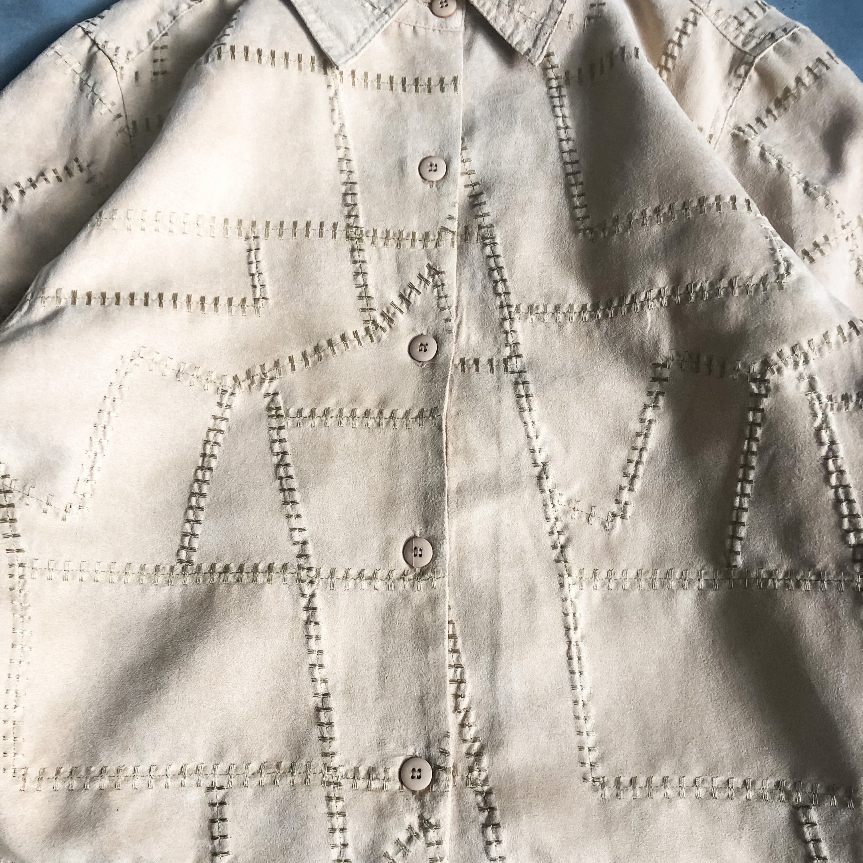 特徴 :ライトベージュ系の春らしいカラーリングのフェイクスエードシャツ。