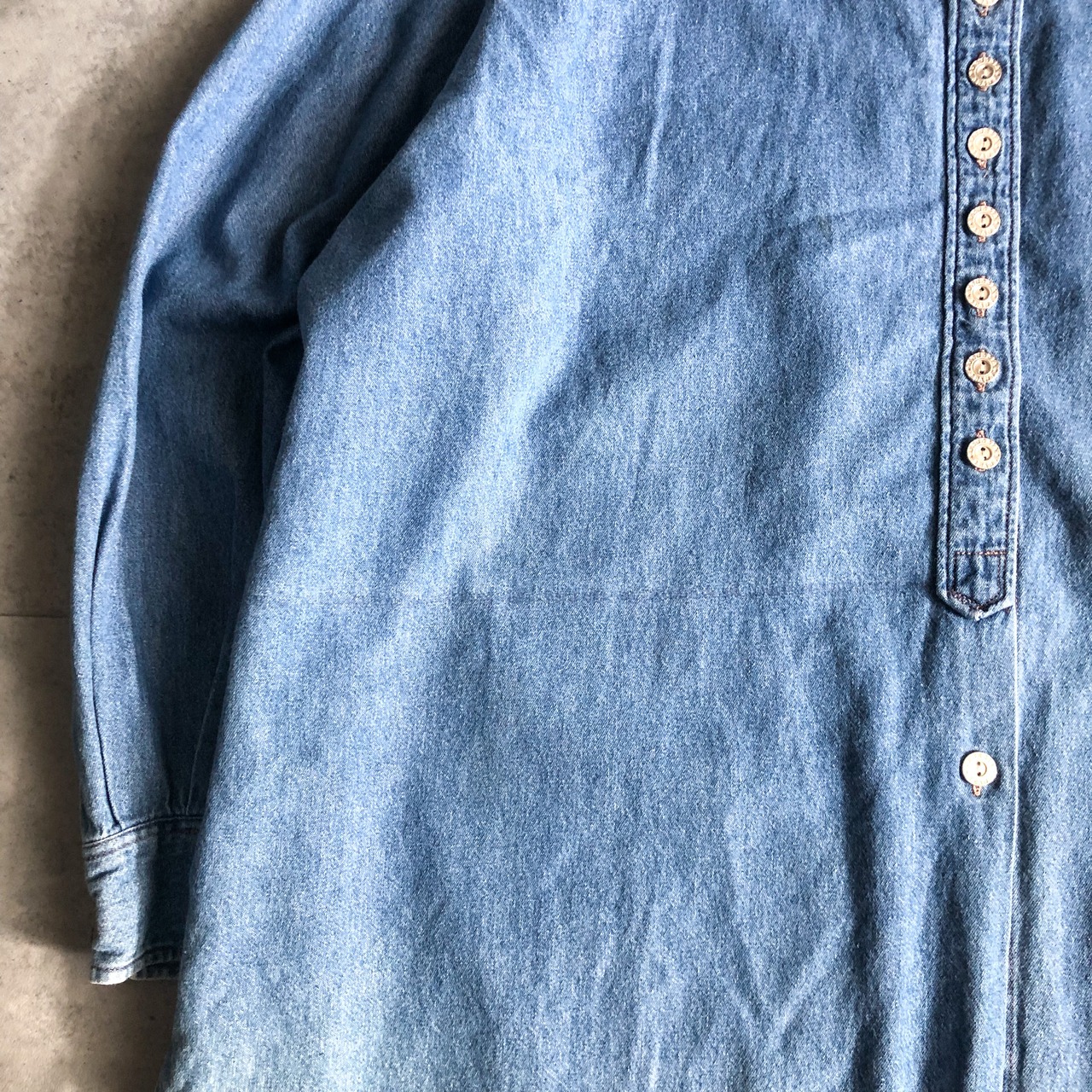 特徴 :ビッグサイズにアンティークのようなフロントに多数のフロントボタンが付く1990's頃のデニムシャツ。