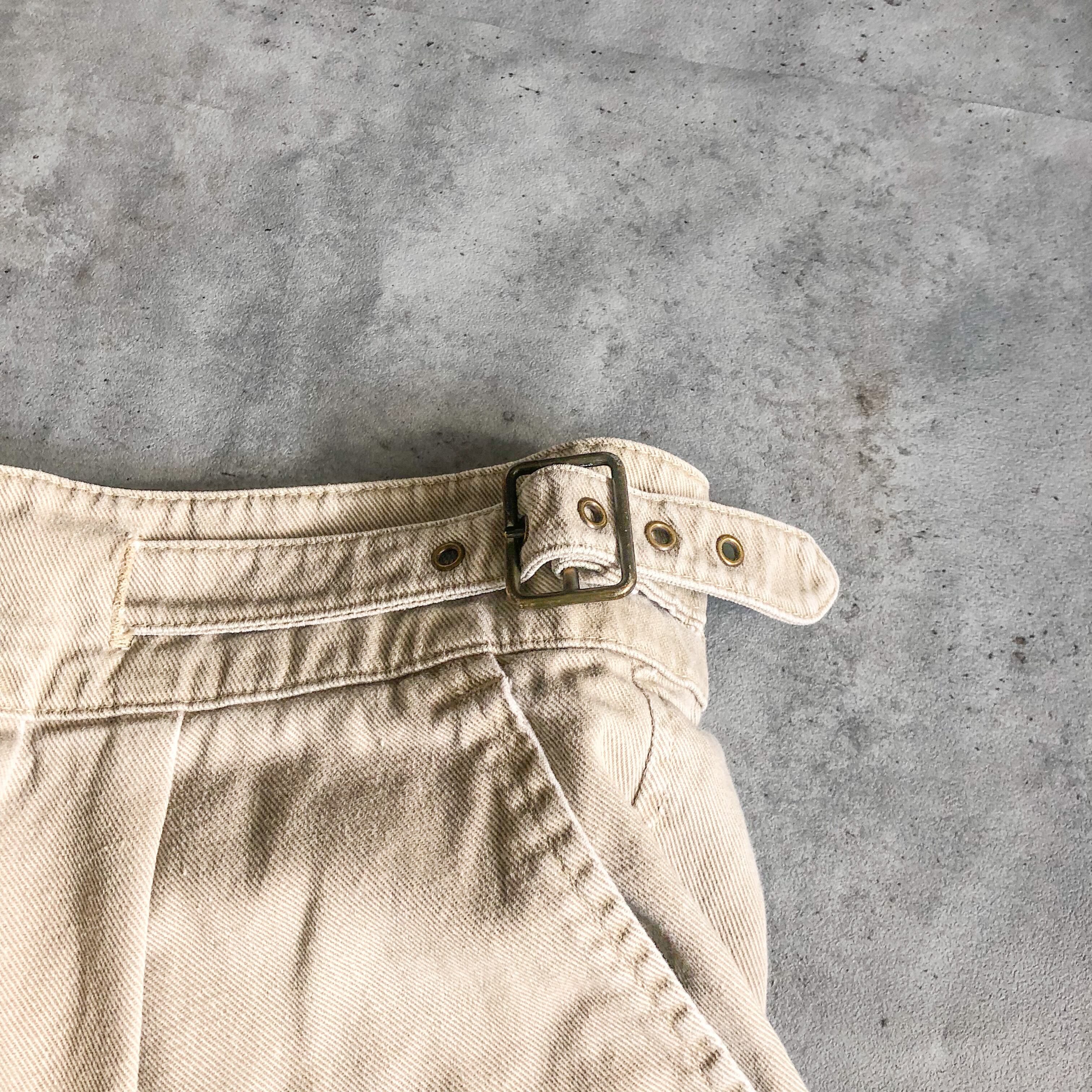 ネパール戦争(グルカ戦争)後に、グルカ兵が穿いていた物から名付けられたグルカパンツは年代によって仕様は異なるものの、共通の仕様は大きな持ち出し式のベルトが最大の特徴。