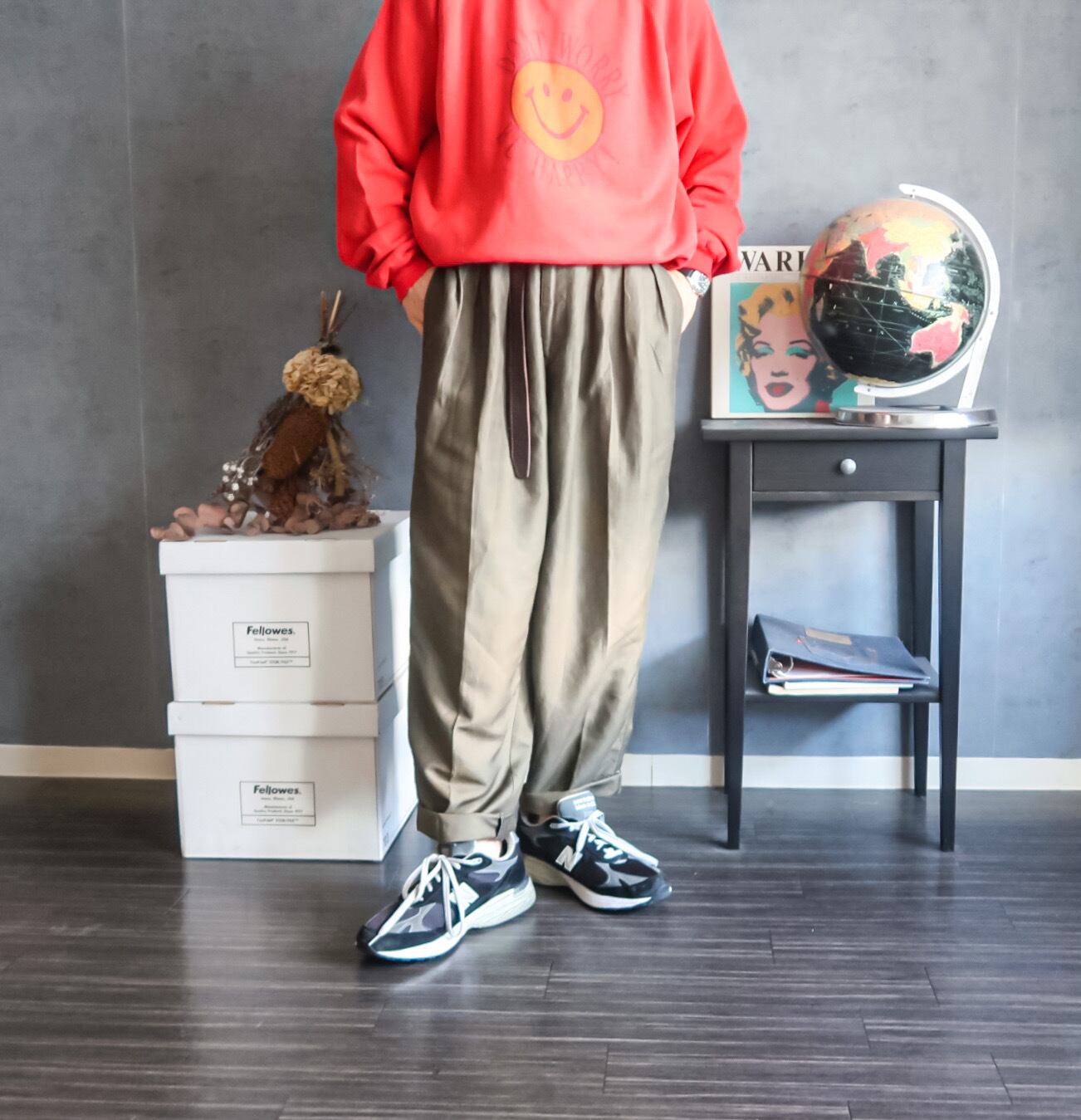 スリータックでもも周りは太めで股上深め、裾にかけてしっかりとテーパードのかかる面白いシルエット。