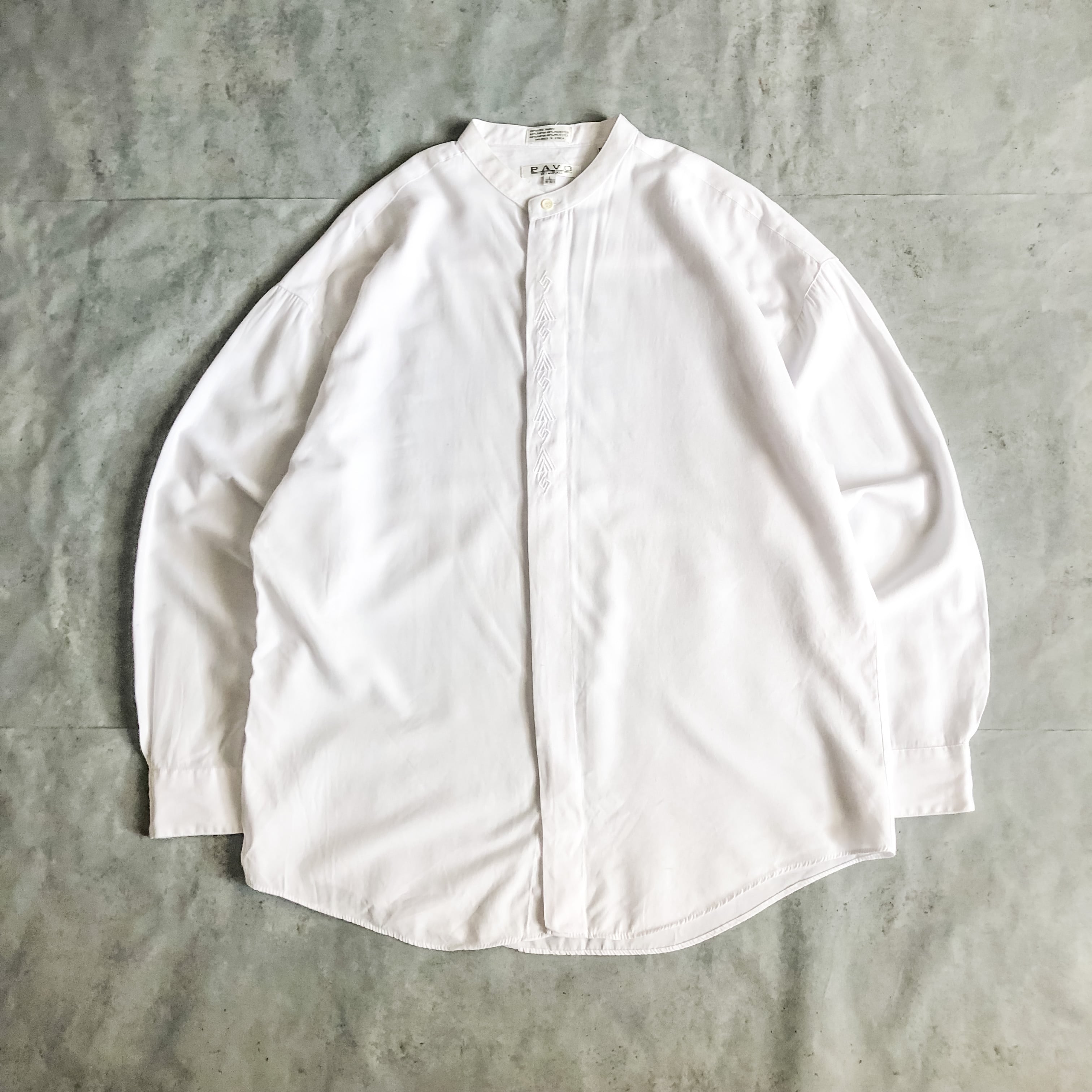 1990's~ bigsize white embroidery design band collar shirt