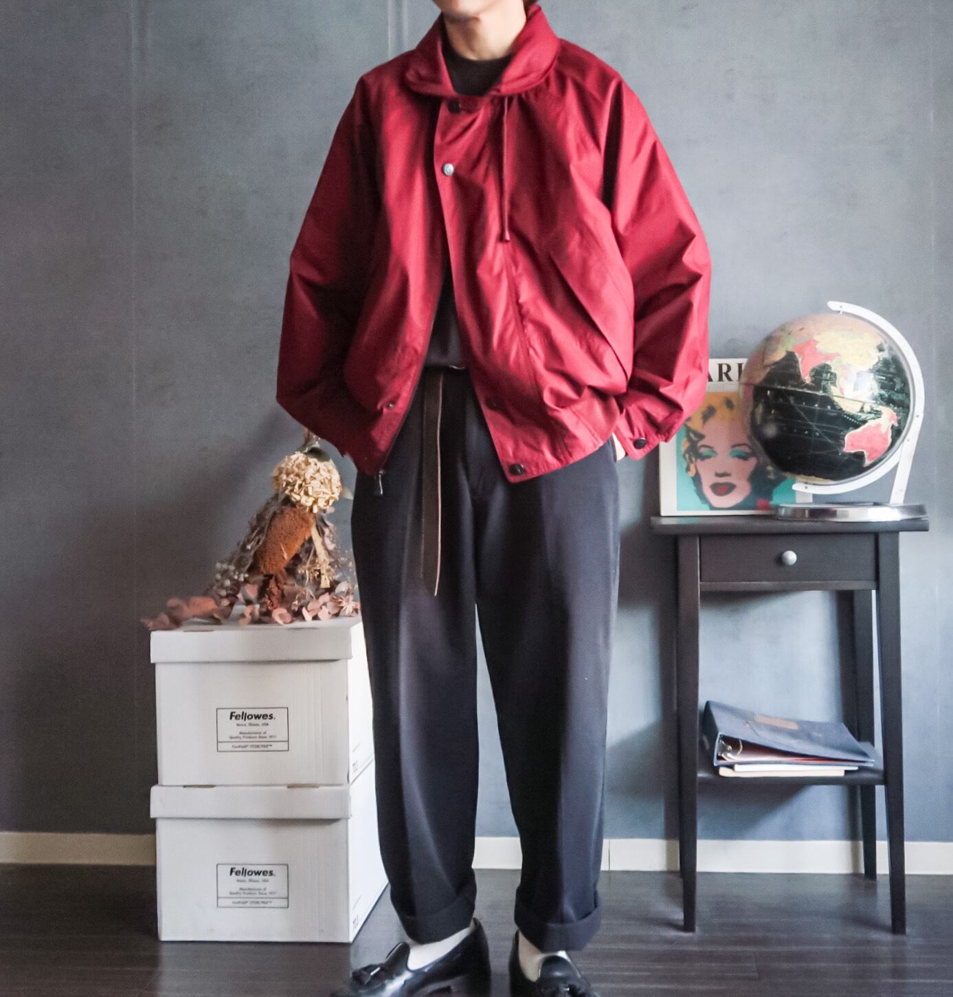 秋冬らしいマルーン系のカラーリングに、ツーポケで比翼仕立てになったクールなデザイン。