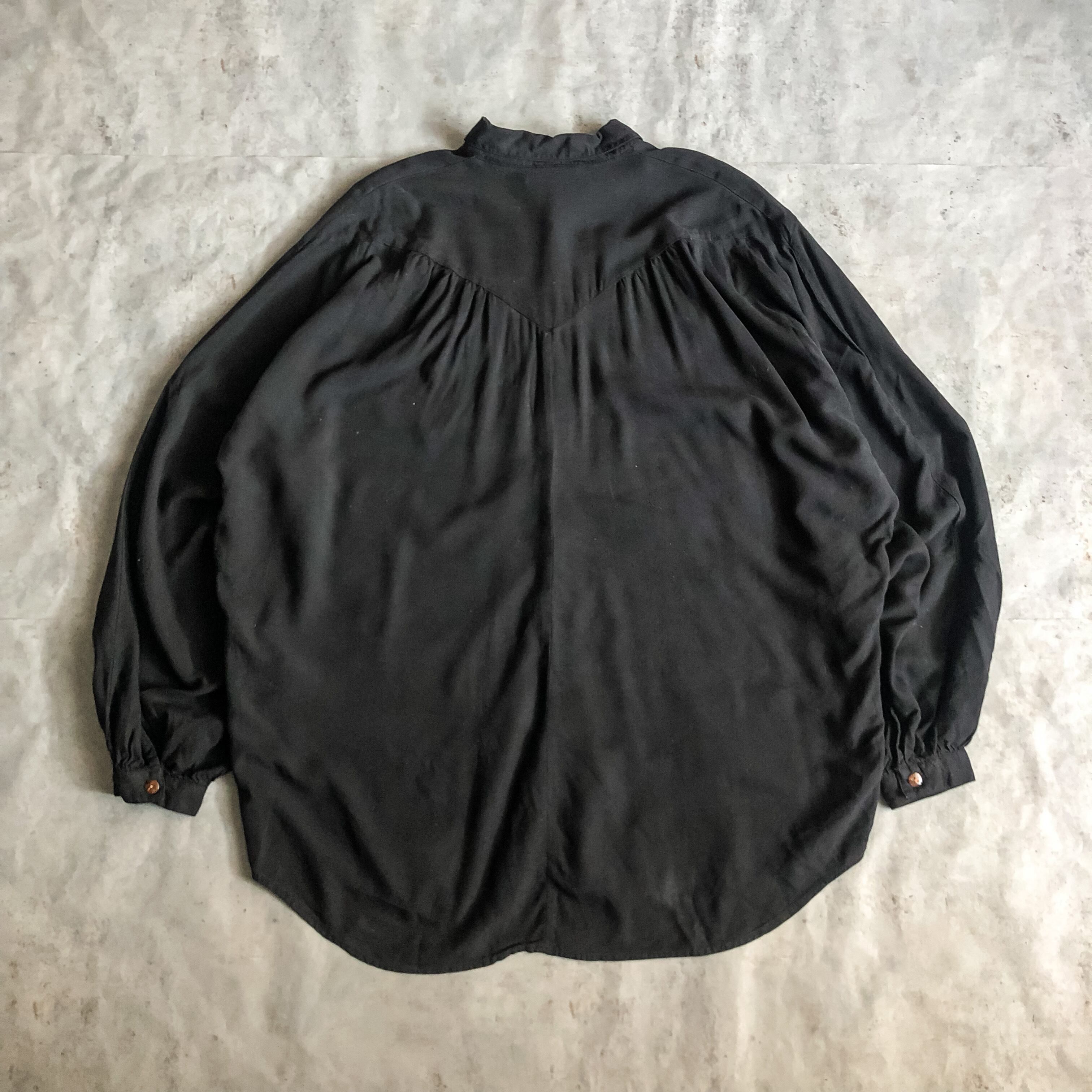 1980's~ bigsize black dolman×volume sleeve rayon shirt