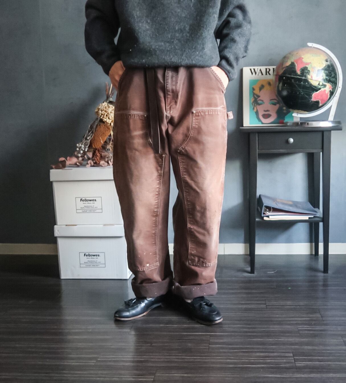 太めのシルエットでダブルニー、硬くて丈夫な質感とリアルワークを感じるかなりフェードしたブラウンカラーが最高にクールな一本。