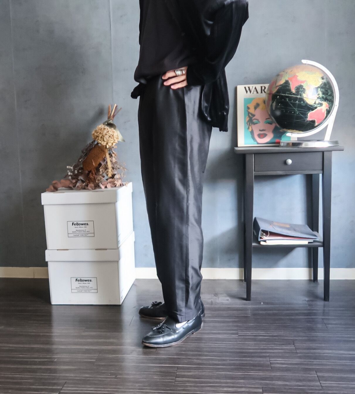 特徴 :素材による少し光沢感のある絶妙なブラックカラーが独特な表情を醸し出してくれるクールなシルクスラックス。