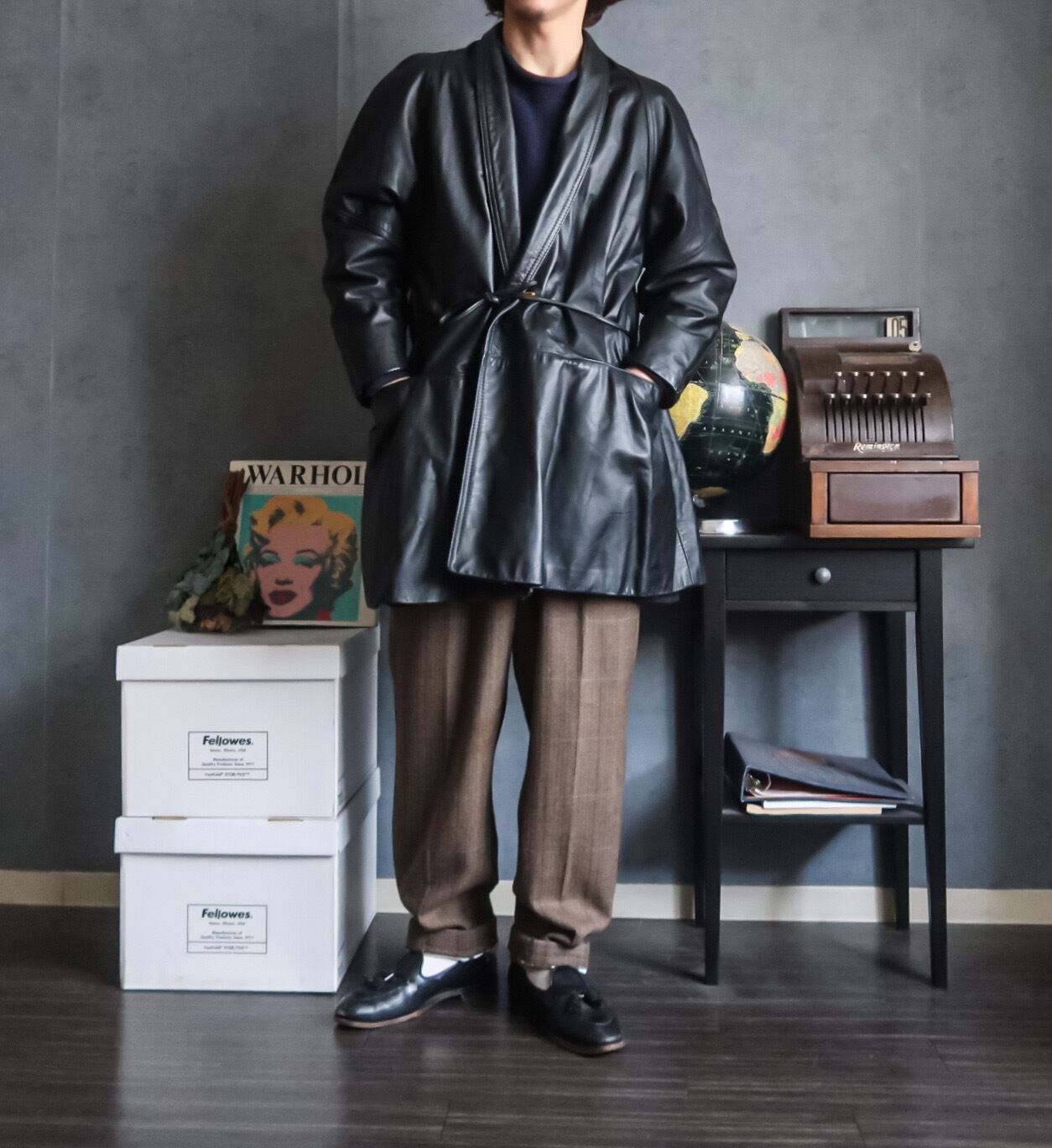 フロントはボタンが付かずガウンのようになっており、共布のレザーでも絞れる珍しいデザイン。